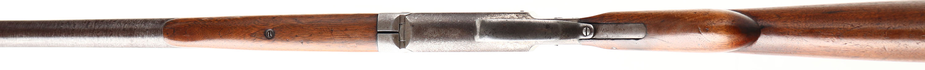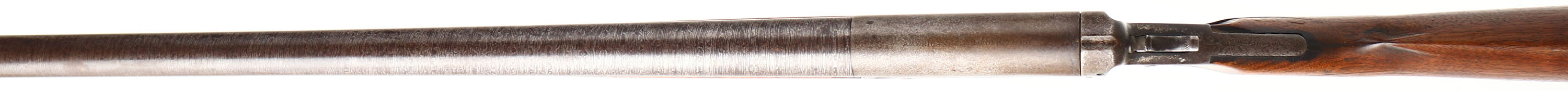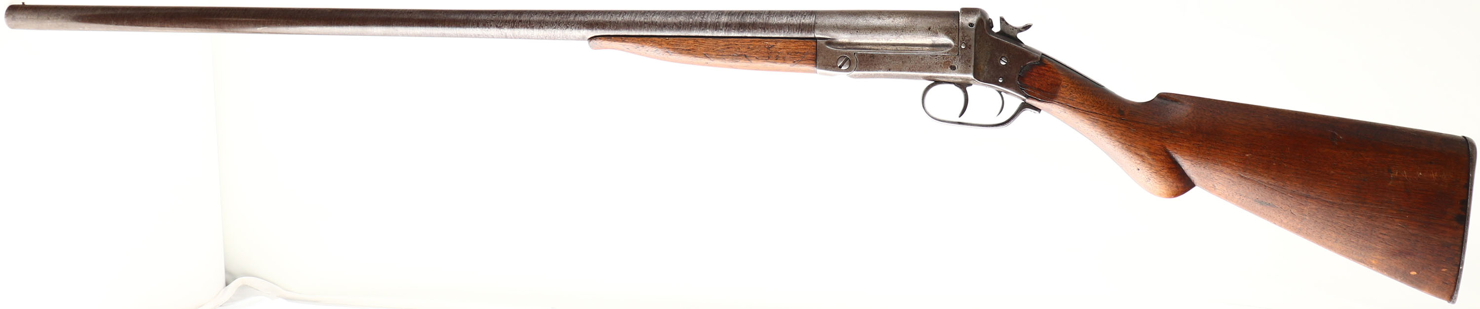 C.S. Shattuck, Model ''American'', CAL:10 Ga., MFG: early 1890's, SN: 638, Break Action Single Shot Shotgun, 34'' barrel. The round knob wood stocks are fair & solid, despite a 4'' & 5'' crack on each side of the wrist emanating from the back of the receiver. There is a silver pin on the right side of wrist adding stability. There stocks exhibit several small scrapes, scratches & contusions to the original finish. The browned finish on the damascus twist barrel is very good. The case-hardened receiver has worn mostly gun metal gray with a spotty thin brown patina. Top of receiver is stamped ''AMERICAN LONDON WEST''. Bore is good, but with roughness & visible striations. The front trigger serves as the break lever for the barrel. The barrel holds a single front bead. Stock carries a smooth metal buttplate. Few of these early large gauge shotguns have survived, so even examples with lot of wear & use still are in high demand amongst collectors of these shotguns. Antique, No FFL Req. - Value: 500 to 1000