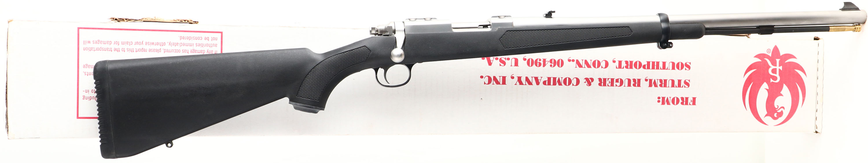 BOXED, Ruger, All Weather 77/50, CAL: 50, MFG: Modern, SN: 730-18259, Percussion Blackpowder Bolt Action Rifle, 22'' barrel. The checkered & capped synthetic stock is excellent. The stainless steel finish on the barrel & receiver is excellent. Bore is mint. The barrel holds a folding leaf rear sight & blade front sight. The receiver has an integral scope base. Stock has sling studs & a grooved black rubber recoil pad. Comes in factory box, with related paperwork, lock & scope rings. NIB. Blackpowder, No FFL Req. - Value: 500 to 800