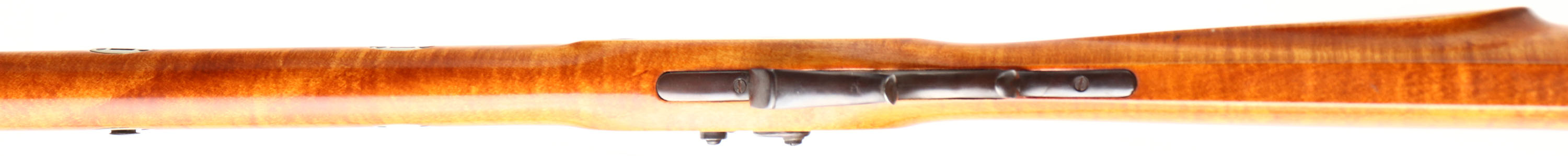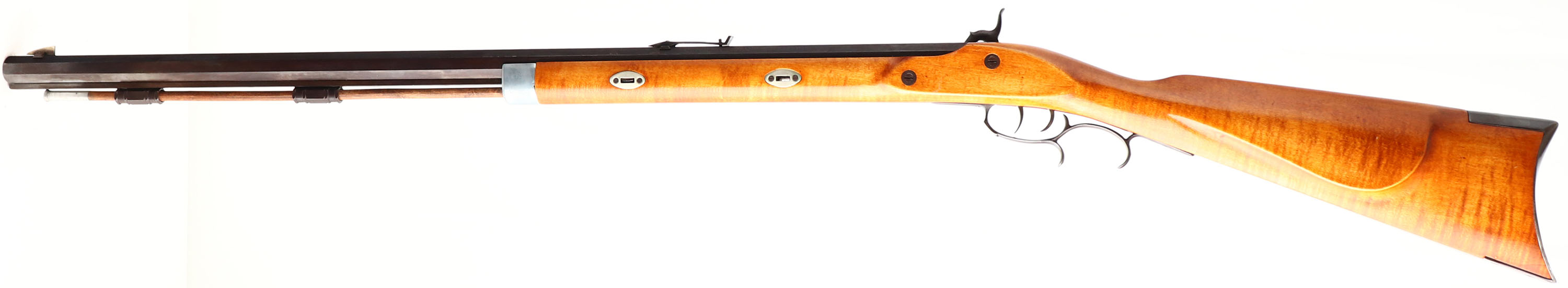 Connecticut Valley Arms, Plains Rifle, CAL: 45, MFG: N/A, SN: 0040485, Percussion Muzzleloader Rifle, 32'' octagon barrel. The cheeked straight grip wood stock is excellent. There is a small hairline crack on the bottom left corner of the stock. The rear barrel wedge is missing. The high gloss finish is excellent. The metal blue finish is a mix of blued finish & brown patina. Bore is excellent, with powder remnants. The barrel holds an adjustable rear sight & blade front sight. The elevator on the rear sight is missing. Stock has a crescent metal buttplate. Ramrod present, but the end is broken. Double set triggers. Blackpowder, No FFL Req. - Value: 200 to 400
