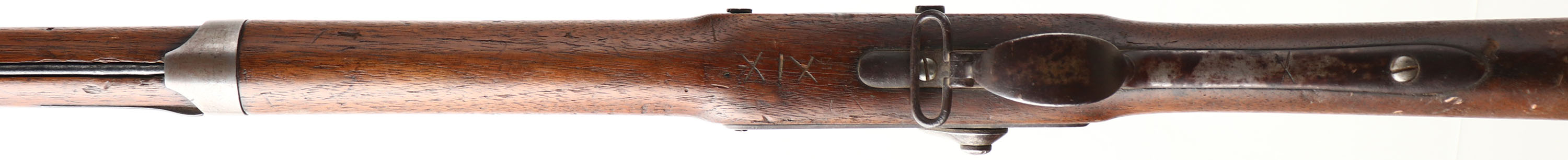 Springfield, Model: 1842 Musket, Cal: .69, MFG: 1851, Antique, S/N, N/A, Percussion musket muzzle loader, 42'' round barrel. The straight wrist walnut stock is very good with nicks, dings, scratches & wear from use/age, ''XIX'' hand etched into bottom of stock Infront of trigger guard. The metal is bare steal with patina near hammer from firing. Lock plate is marked with a eagle over ''U.S.'', ''SPRING'', ''FIELD'', ''1851'', top of barrel is marked ''V'', ''P'', over eagle, ''X'' has been hand etched into lower tang. Bore is fair has some light pitting & rust. Small front sight blade on front barrel band. Steel butt plate. Bottom sling loops, has ram rod. Antique/Muzzleloader. No FFL Req. - Value: 500 to 1000