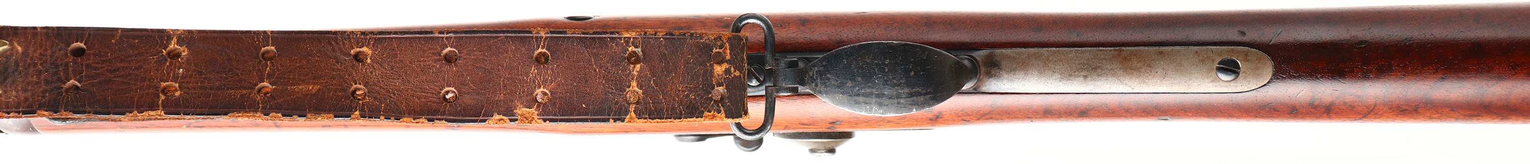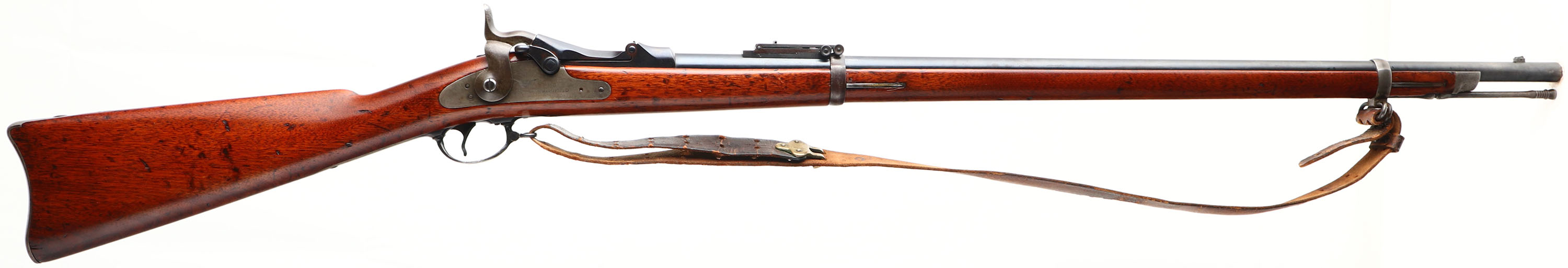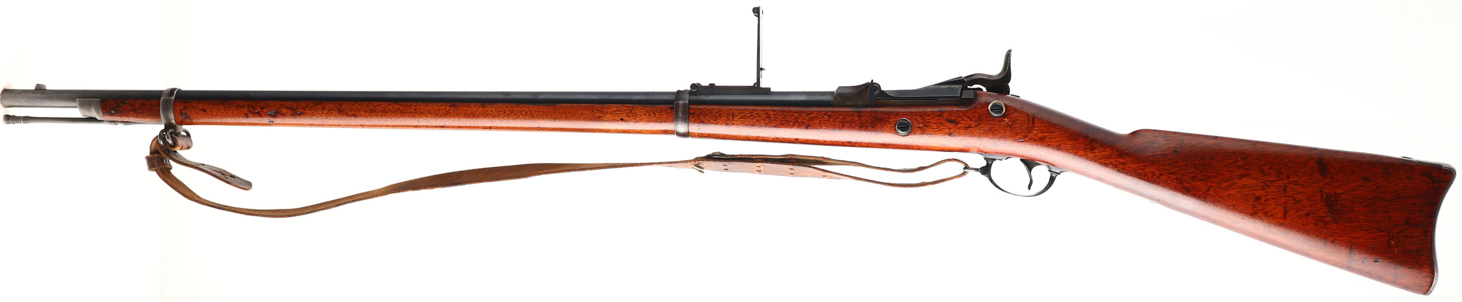 Springfield Armory, Model: 1884, Cal: 45-70, MFG: 1889, Antique, S/N: 467216, Trapdoor single shot rifle, 32 1/2'' barrel. The straight wrist wood stock is good, has light scratches & dings, stock has been sanded & a thin high gloss finish has been added, faint cartouche remains on left side of stock above trigger. The metal has been re-finished & rates 75% overall with wear & scratches. Top of breech block is marked ''U.S.'', ''MODEL'', ''1884'', rear of receiver is marked with S/N, left side of barrel is marked ''V'', ''P'', over a Eagles head, & ''P''. Bore is very good, bright & shiny with lightly thinned rifling. Chipped blade front sight with a Buffington rear sight marked 2 to 20. Steel butt plate marked ''US'' on the upper tang. Bottom sling swivels. Has cleaning rod, comes with leather sling. Antique No FFL Req. - Value: 500 to 1000