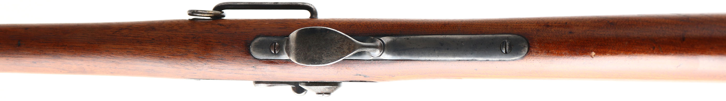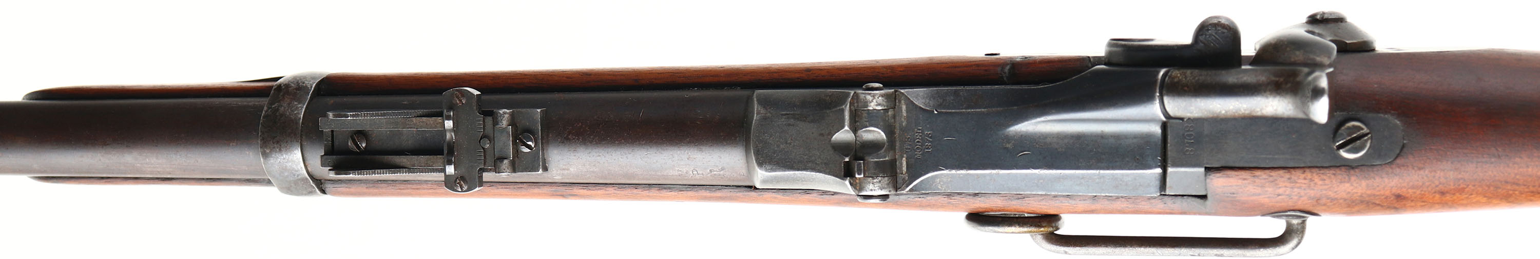 Springfield Armory, Model: 1873 Cavalry Carbine, Cal: 45-70, MFG: 1878, Antique, S/N: 87082, Trapdoor single shot rifle, 22'' barrel. The straight wrist wood stock is very good, stock appears to have been lightly sanded & oiled, added finish visible in some areas of stock, no visible cartouches on stock. The metal has toned to a gray/brown patina with light rust speckling & has scratches in areas. Top of breech block is marked ''U.S.'', ''MODEL'', ''1873'', rear of receiver is marked with S/N, left side of barrel is marked with a very faint ''V'', ''P'', over a Eagles head, & ''P''. Bore is good, bright with thinned rifling & mild roughness throughout. Blade on block front sight with a tangent/ladder, buckhorn rear sight marked 1 to 8 on base & 8 to 15 on ladder, sight base & ladder is also marked ''C''. Steel trapdoor butt plate marked ''US'' on the upper tang, full cleaning rod set inside stock. Saddle ring & bar sling mount. Antique No FFL Req. - Value: 600 to 1200