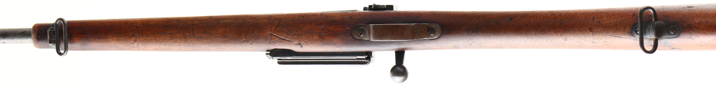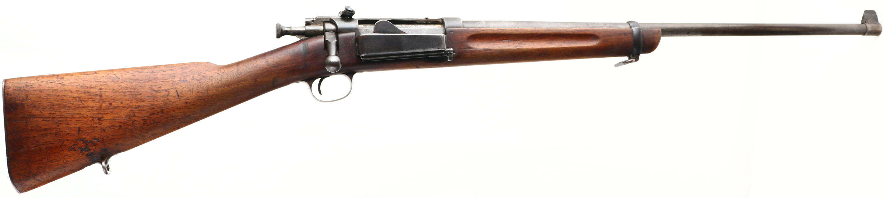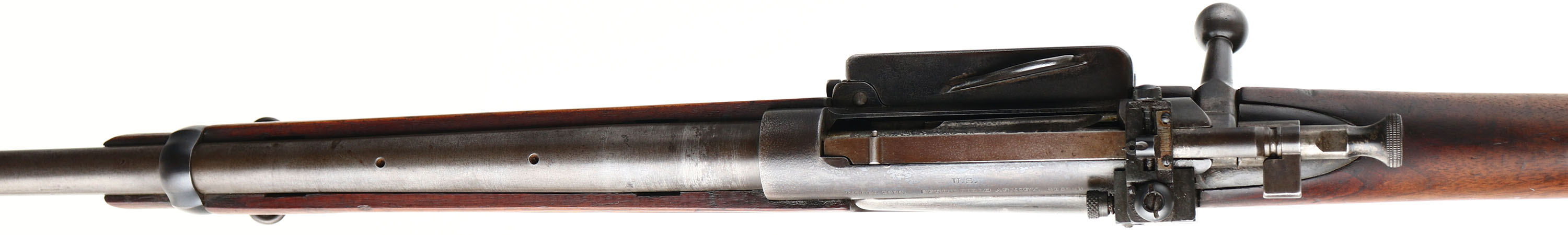 Springfield Armory 1898 Krag , CAL: 30-40 Kraig, MFG: 1901, SN: 315228, Bolt Action Rifle, 24'' original barrel. Stamped U.S. on receiver. The original cut-down stock is good, but with numerous small contusions, scrapes & scratches to what appears to be the original finish, as typical or war use. It has The circle P proof stamping behind the trigger guard along with a small ''50''. In front of the trigger guard is the date ''1930'' & a row of worn illegible letters & numbers. The boxed ''JSA'' inspector's initials & 1901 date inspectors cartouche is clearly stamped above the left side trigger guard, with the letters ''H.H.'' stamped below the receiver sight. The number ''5.5'' is stamped on the upper comb just in front of the upper tang of buttplate. The name ''OTTO COSS'' is stamped inside the forend finger groove on both sides. Otto Coss was a well known blacksmith & wood worker out of Montana. There is actually a working forge blacksmith shop museum run by the Madison Valley History Association in his name. Stock has been cutoff 1 1/2'' above the forend retention barrel band. The metal finish has worn mostly gun metal gray, with a thin brown patina & some remains of original finish in protected areas. The receiver carries a Lyman adjustable receiver sight, while the barrel carries the original front blade sight. No visible markings on barrel. Bore is good. Buttstock carries a trapdoor metal buttplate & sling loops. A interesting Krag, with a curios tie to Otto. FFL or C&R Req. - Value: 200 to 400