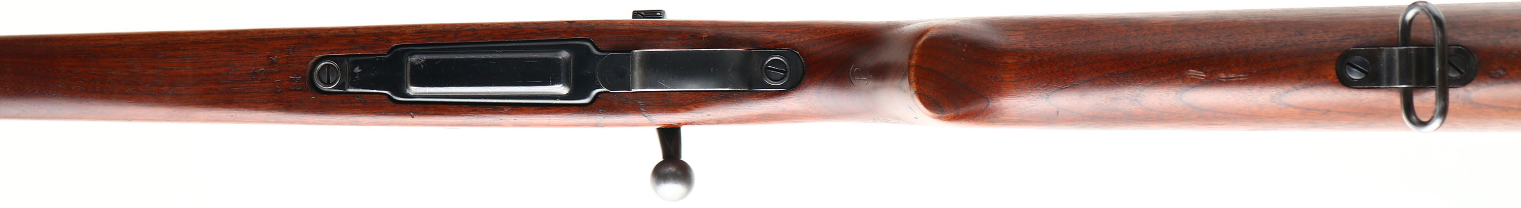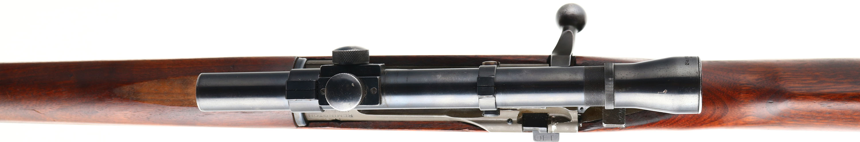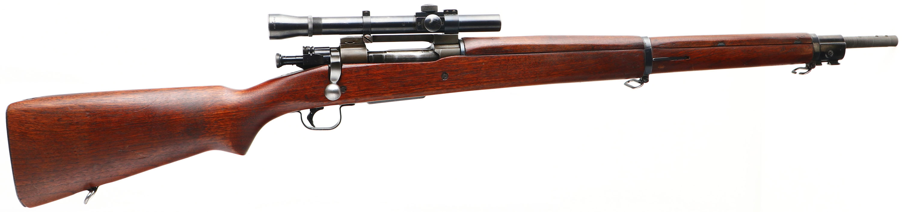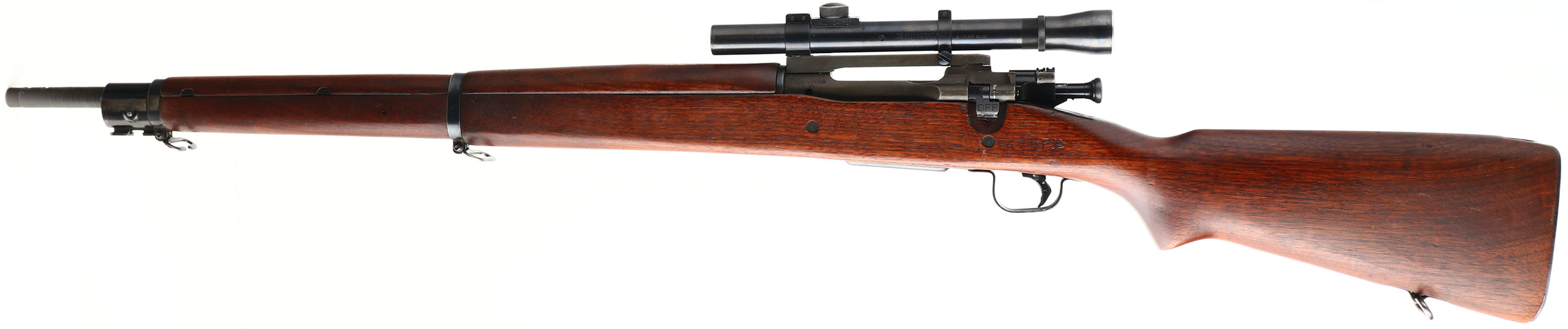 Remington, Model: 03-A4 Sniper, Cal: .30-06, MFG: 1943, S/N: 3424569, Bolt action rifle, 24'' barrel. The Semi-Pistol grip type C Walnut stock is excellent with only minor scuffs/scrapes, ''P'' in circle cartouche on bottom of pistol grip, ''RA'' crossed cannons ''FJA'' cartouche on left side of stock above trigger, ''3'' ''z'' ''72'' in circle ''37'' in square, cartouches on bottom of stock Infront of magazine. The parkerized metal finish rates 85% with light wear in areas. Top left of receiver is marked ''U.S.'', ''REMINGTON'', ''MODEL 03-A3'', top right of receiver is marked with the S/N, end of barrel is marked ''R A'', flaming bomb, ''8-43'', & ''P'' on the bottom. has a replaced aftermarket wide trigger that has a light trigger pull. Bore is excellent, bright & mirror like, has 2 groove rifling. Has the later Lyman Alaskan 2.5x scope with the all weather recital & a Redfield scope mount, which is all period correct. The Lyman Alaskan scope was preferred by the army but the 03-A4 originally went to war with the Weaver 330 because the army could not get enough of the Lyman scopes, and most of the fighting with the 03-A4 was done with the weaver but the Lyman scope did see some service on the 03-A4 near the end of the war. Steel trapdoor butt plate, has cleaning kit inside. Bottom sling mounts with stacking swivel. FFL or C&R Req. - Value: 2000 to 4000