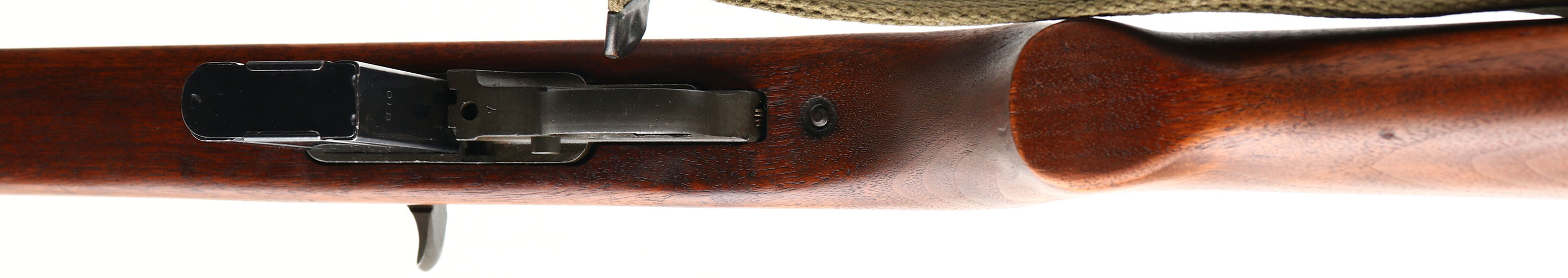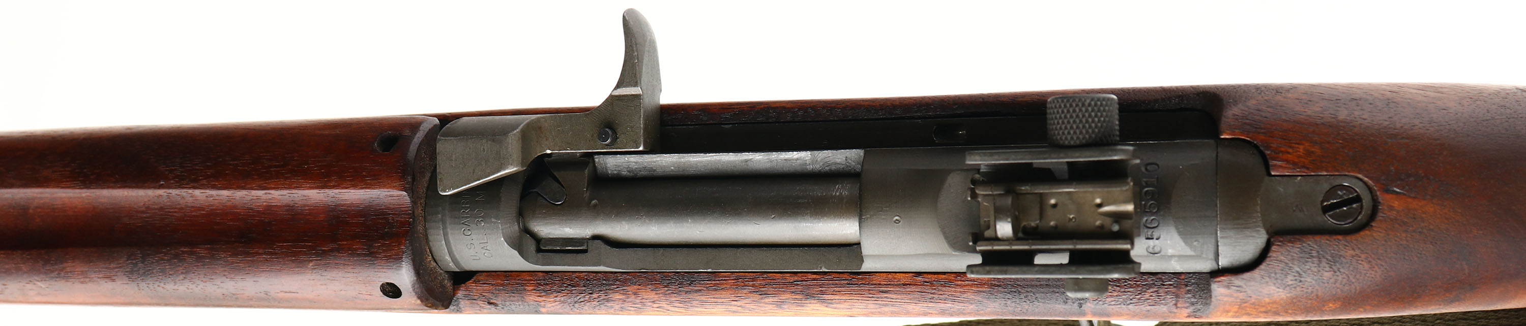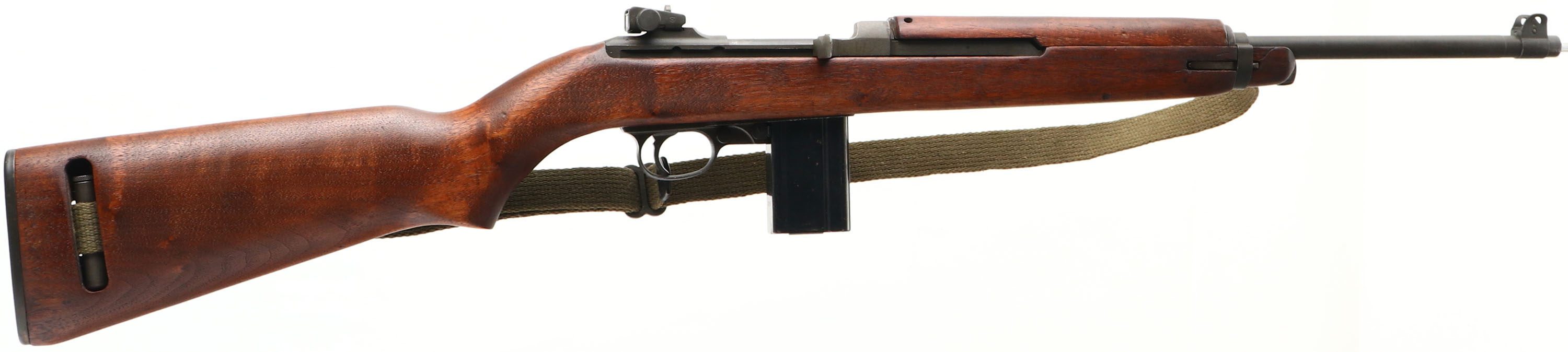 Winchester, Model M1 Carbine, Cal: .30 Carbine, MFG: 1945, S/N: 6565910, Semi-auto rifle, 18'' barrel. The Semi-pistol grip Type 3 stock is very good with light scratches, dings & wear from use/age, stock has darkened from oil/age, faint Springfield arsenal crossed cannons crest on right side of stock on the cheek, faint markings on inside sling well. The grey parkerized metal finish rates 85% overall with areas of light wear & scratches. Rear of receiver is marked with ''WINCHESTER'', & S/N, front of receiver is marked ''U.S. CARBINE'', ''CAL .30M1'' top of barrel is marked ''W''. Bore is good, bright & clean bore with worn but still present rifling. Blade front sight with protective wings, has the updated windage & elevation adjustable rear aperture sight marked 1 to 3. Checkered steel butt plate. Side sling mounts. Has oilier bottle & green canvas sling. The rifle has the original push through safety. Rifle comes with one 15 Rd. mag, a nice rifle with a mix of old & updated parts. FFL or C&R Req. - Value: 1400 to 2800
