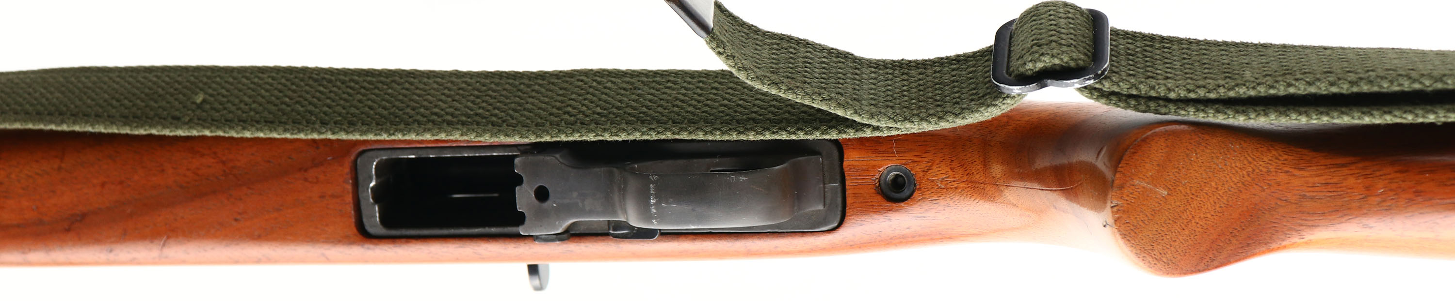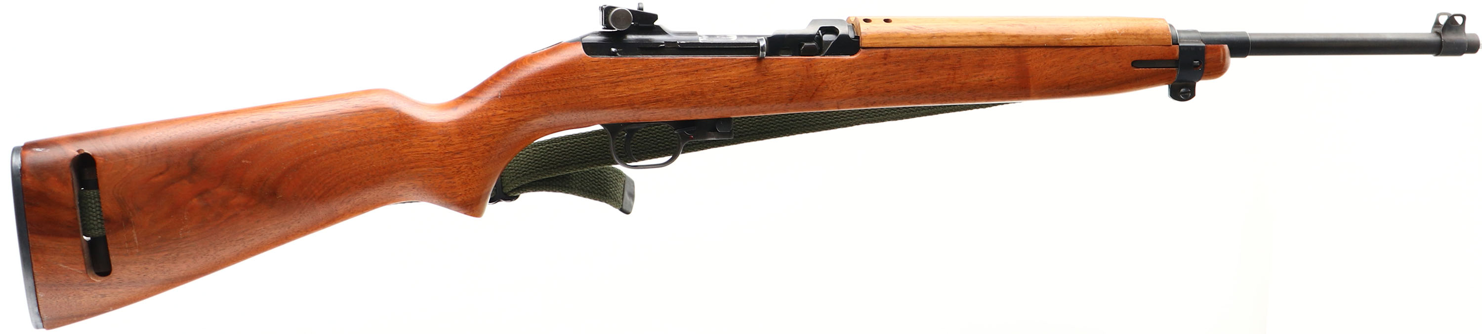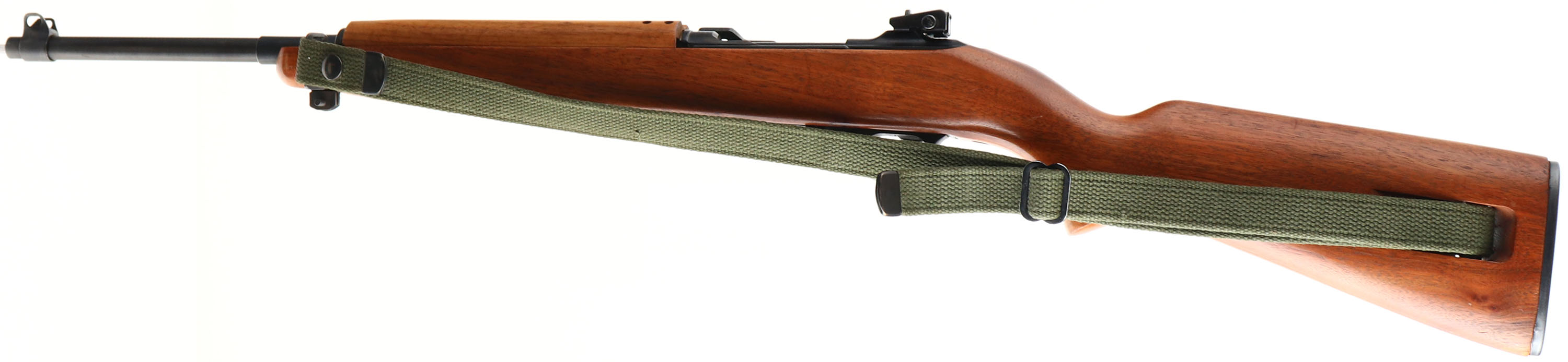 Universal, Model: M1 Carbine, Cal: .30 Carbine, MFG: 1961-72, S/N: 190301, Semi-auto rifle, 18'' barrel. The semi-pistol grip walnut stock is excellent with minor wear. The blued finish rates 93% with areas of normal wear. Rear of receiver is marked with S/N, front of receiver is marked ''UNIVERSAL'', ''HIALEAH, FLA.'', & Patent number. Bore is excellent. Blade front sight with protective wings, fully adjustable aperture rear sight. Checkered steel butt plate, side sling mounts. Has oiler bottle, comes with green canvas sling. No Mag, A excellent M1 carbine replica that doesn't have all the wear & tear as the originals. FFL or C&R Req. - Value: 600 to 1200