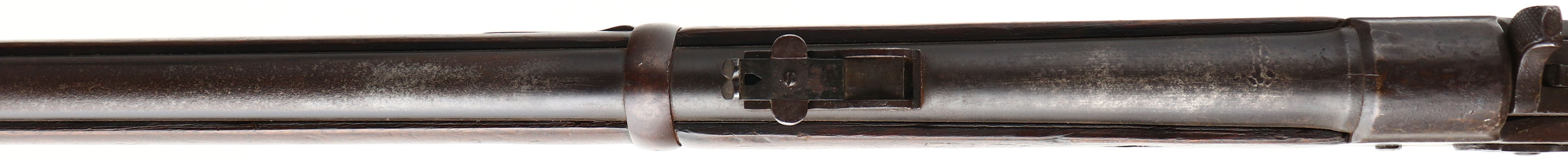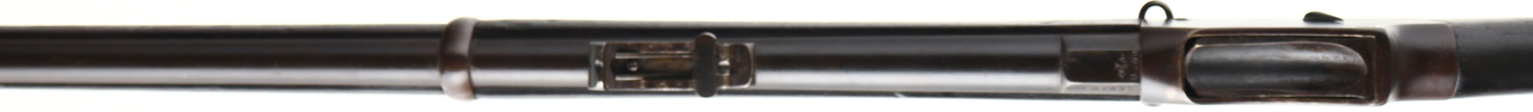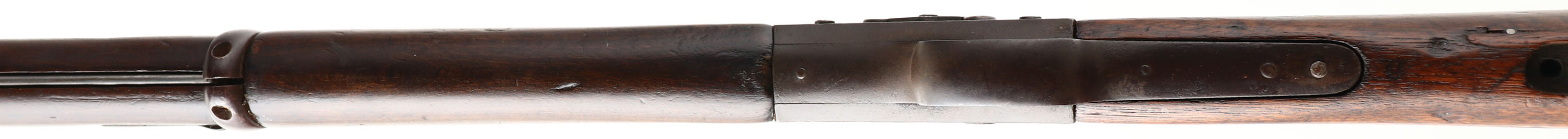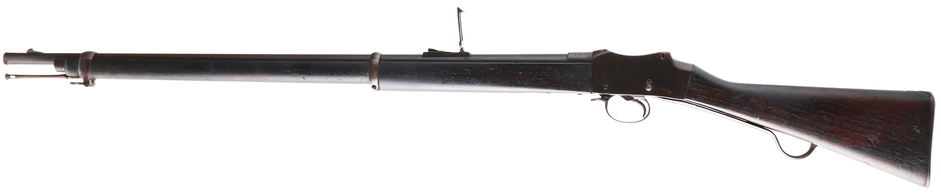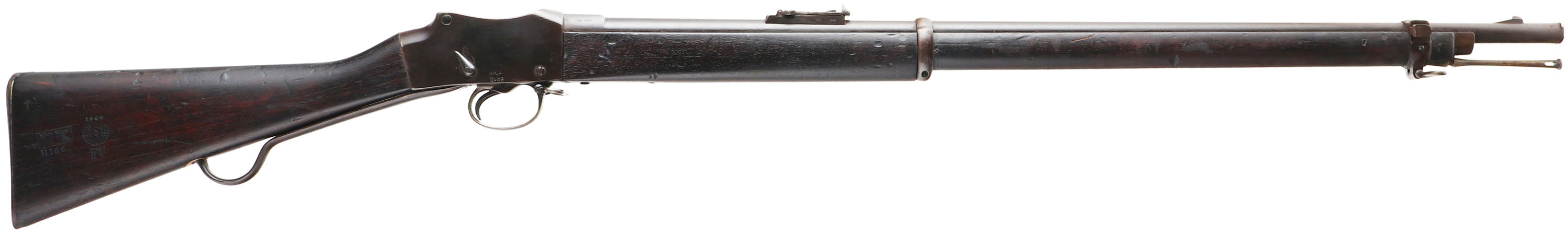 Enfield (Kirkee Arsenal), Model: MK IV, Cal: .577/450 Martini-Henry, MFG: 1887 (Re-Assembled in 1908), S/N: E2069, Lever breech loading single shot rifle, 33 1/4'' barrel. The two piece straight wrist stock is very good & shows wear & tear from many long years of service, wood has darkened from oil/age, plugged hole from where the short level from a MK 3 would have ended, 1.5'' x 1.5'' plug repair at top of stock next to butt plate, Kirkee Arsenal cartouche's on right side of stock on cheek with 1908 date. The metal has been re-blued likely when it was assembled in 1908 & rates 85% overall with areas of wear & scratches. Right side of receiver has original markings that are faint but reads, Crown over ''V.R.'', ''ENFIELD'', ''1887'', proof mark, ''IV'':, ''1'', the new markings are sharp & clear & read ''KK.'' arrow ''A.'', ''11.08'', left side of receiver is marked with a British proof mark, left side of barrel is marked with S/N & British proof marks, top of barrel is marked ''KK.'' two arrows ''A.'', ''11.08'', right side of barrel is marked with more British proofs, lower front tang, trigger guard, lever & bottom of receiver under lever is all stamped with British proofs. Bore is very good, bright with some roughness. Barleycorn on block front sight, tangent/ladder V-notch rear sight marked 100 to 400 on base, 5 to 12 on ladder. Steel butt plate that has cleaned pitting & toned to a brown patina, has one replaced brass screw. Bottom sling loops, has cleaning rod. A Fairly interesting rifle, its started its life as a front line rifle for the British in 1887 two years before production stopped, at some point it was taken off the front line and broken down for parts, the parts was shipped off to India in 1908 and re-assembled by them & likely used for many years, then it was likely sold to some middle eastern county & used by them for many more years, before somehow ending up here in the states. This rifle has been around for many years & has seen a lot of action, & now it can be part of your collection. Antique No FFL Req. - Value: 500 to 1000