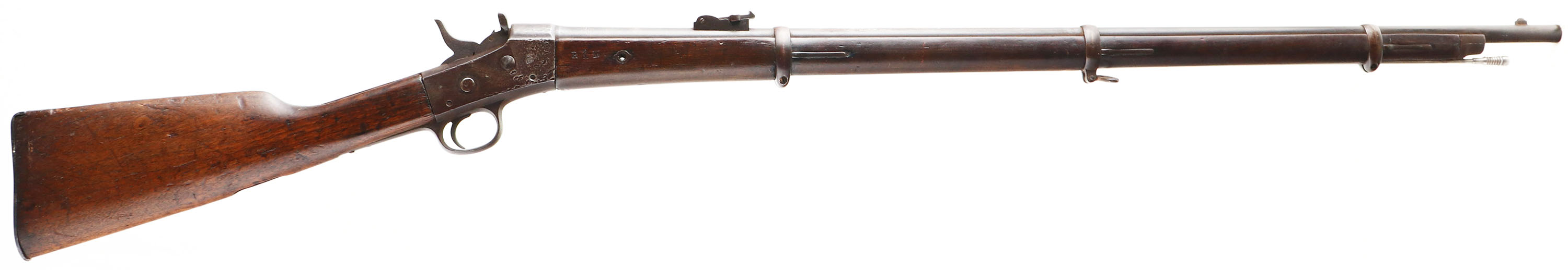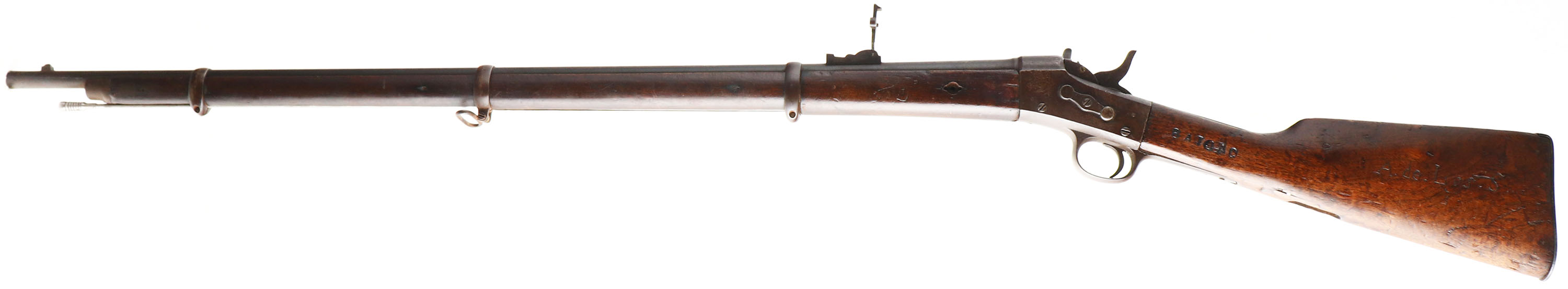 JOHN WAYNE'S ''THE ALAMO'' MOVIE PROP, Remington, Rolling block (Guatemala), .43 Spanish, MFG: 1874-90's, S/N: 188, Rolling block breech loading Rifling, 37'' barrel. This Rifle was used in the movie ''The Alamo'', which was produced by John Wayne's production company Batjac Productions. It is marked ''BATJAC'' on left side of the wrist. This was a stand in prop for a muzzleloader. The straight wrist wood stock is good, with nicks, dings, dents, scratches & wear from use/age. Stock has darkened from oil/age. It is missing sling mount in bottom of stock behind lower tang. Also missing one escutcheon on left side of handguard, right side one is still present. Left side of wrist is marked ''BATJAC'', left cheek is hand marked ''A.de.Lios.S'', left side of hand guard is marked ''PE'', right side of hand guard is marked ''R&M''. Metal has toned to a even gray/brown patina with lots of dings/grind marks, & cleaned pitting on receiver & barrel. Right side of receiver is marked ''AB'', ''188''. Bore is good, bright with pitting & thinned rifling. Blocked barleycorn front sight with tangent/ladder V-notch rear sight, replaced sight on ladder. Steel Butt plate that has light rust pitting. Bottom sling loop on middle barrel band. Antique No FFL Req. - Value: 500 to 1500