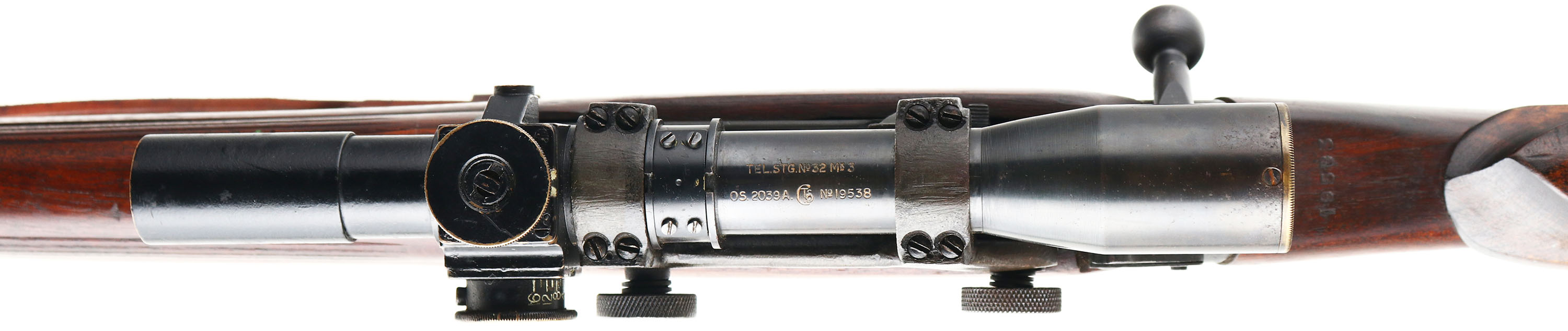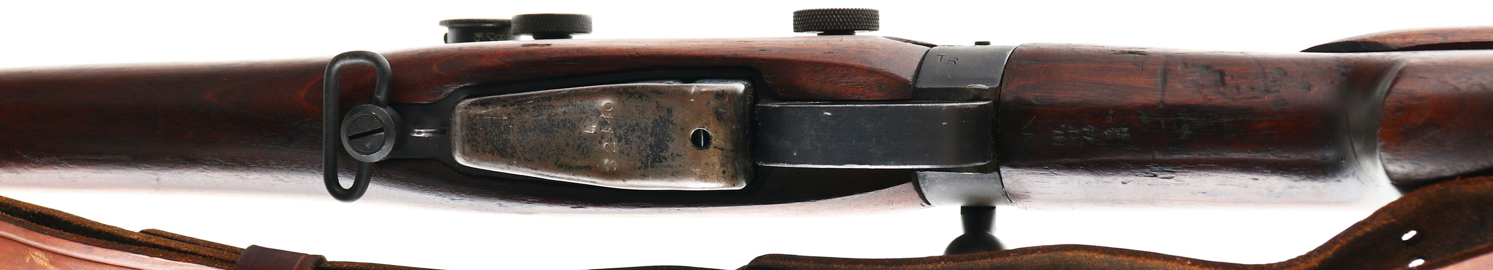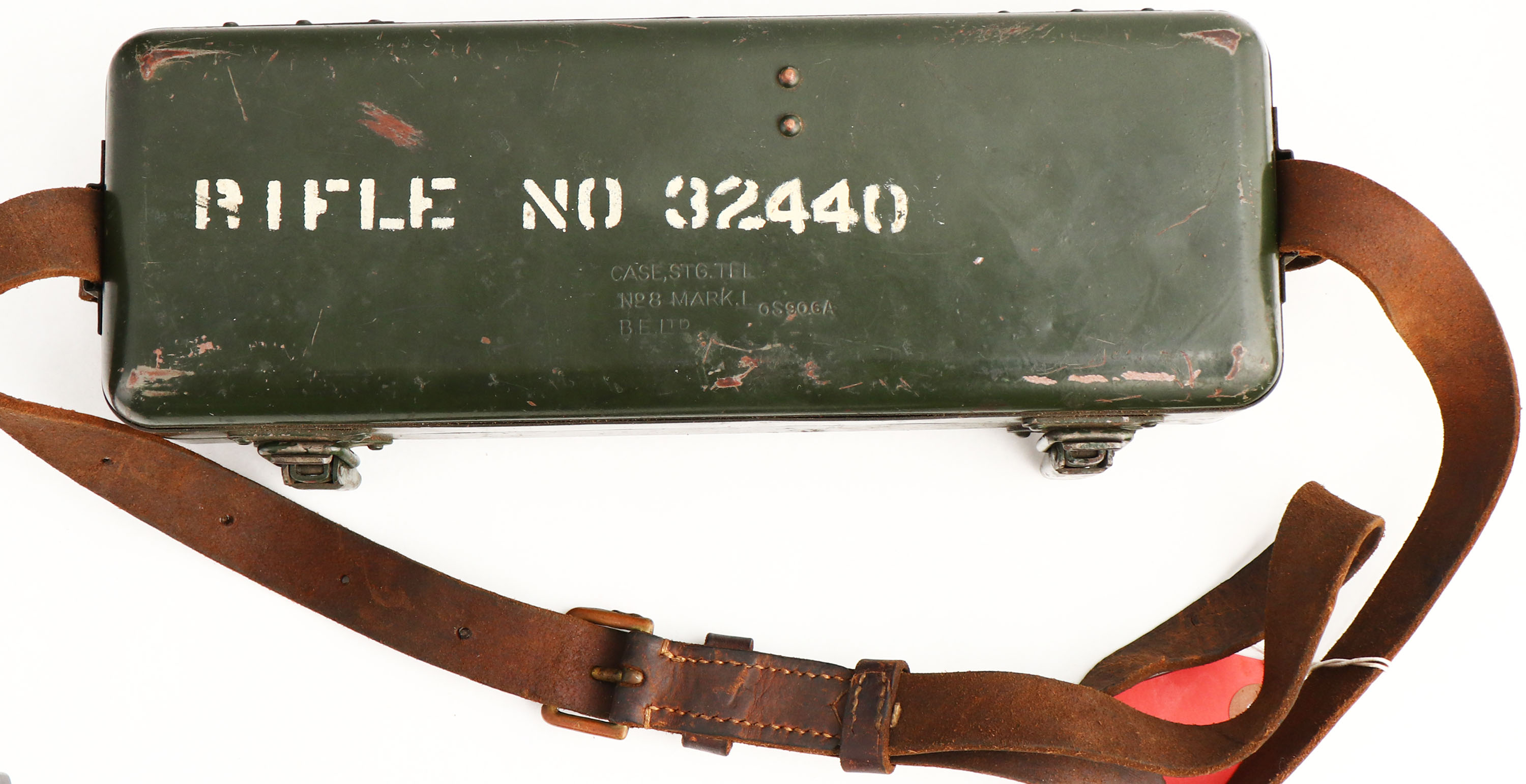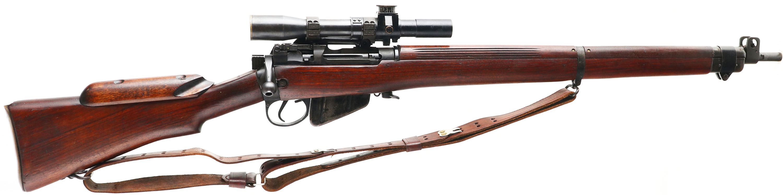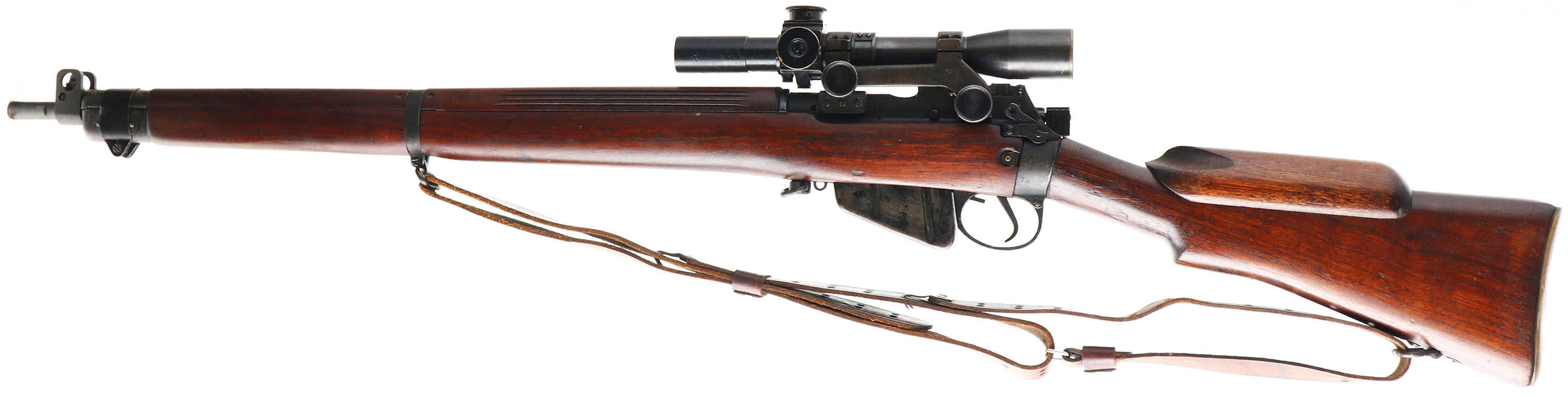 BSA Shirley Model: No4 Mk1 (T), Cal .303 British, MFG: 1944, S/N: L32440, bolt action rifle, 25 1/4'' barrel. The semi-pistol grip wood stock is excellent with only very minor nicks, dings, & wear, the add on cheek riser is standard for the sniper variant, top of wrist is marked ''19583'', bottom of wrist is marked with proof stamps, bottom of pistol grip is marked ''S51'', S/N & one proof marked on bottom of stock by muzzle. The original metal finish on these rifles was blued then coated with Suncorite which is a bake on finish, the finish rates 92% with light wear. Left side of wrist band is marked ''M 47 C'', ''1944'', S/N, & ''TR'', left side of reiver is marked ''No4 Mk1'', bottom end of barrel is stamped with importer marks. S/N matched bolt & magazine. Bore is very good, bright, strong rifling with light roughness in areas. Barrel holds a blade front sight with protective ears, flip up ladder aperture rear sight, has the factory No32 Mk3 scope that's S/N 19583, same as marked on the wrist of stock, rifle also comes with the sterilized case for the rifle & scope. Brass trapdoor Butt plate. Bottom sling loops, comes with period correct leather sling. A nice rare all original, all numbers matching Sniper SMLE with its scope case, which considering how much refurbishment the Lee Enfield's went through its incredibly rare to find a untouched one today, reference Lot # 5744 for a original NO 15 MK1 transit chest for the No4 MK1 (T) rifles. FFL or C&R Req. - Value: 3000 to 6000