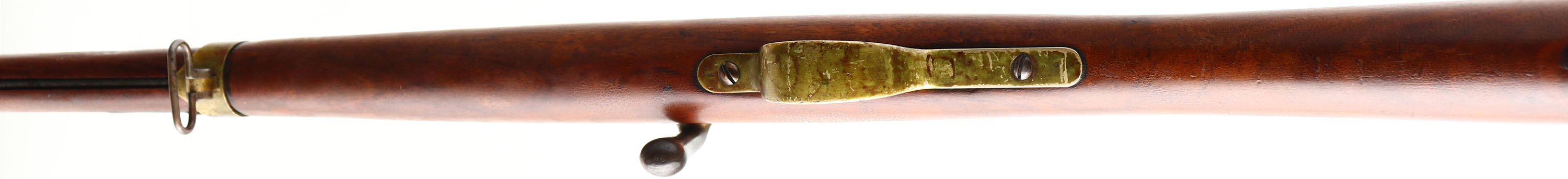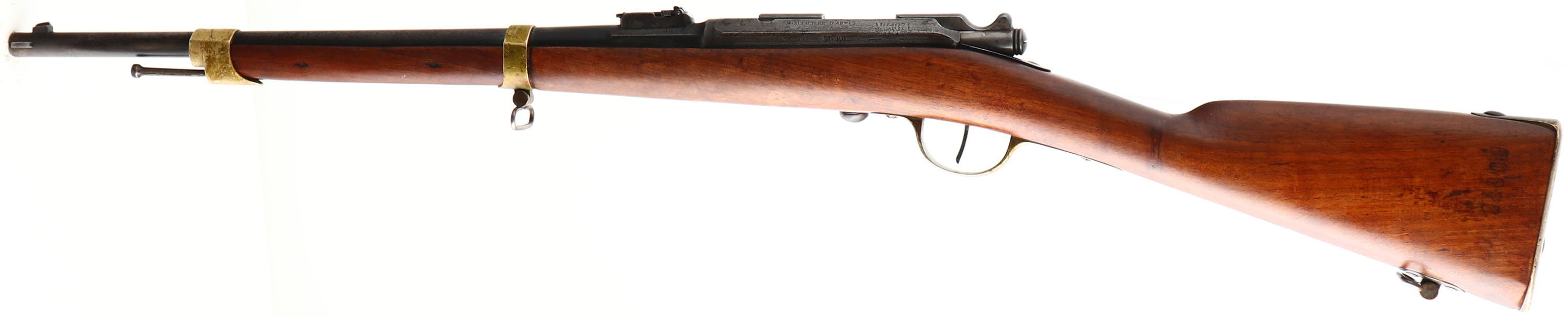 Manufacture d'armes Chatellerault, Model: MLE 1874 Artillery Musketoon (Fusil Gras), Cal: 11x59mmR, MFG: 1883, S/N: A94809, Bolt action single shot rifle, 2 1/4'' barrel. The straight wrist wood stock is good, stock has been sanded & heavily sanded in areas & re-finished, lower tang, upper tang, lower sling loop base, & butt plate are proud to the wood, very faint S/N marking on left cheek that vaguely looks like the S/N on the gun, dogwood plug on right cheek that marks French government property but the cartouche over it has been sanded away. The metal has toned to a even dark gray patina with areas of wear and bear metal showing in spots. Left side of receiver is marked ''MANUFACTURE D'ARMES CHATELLERAULT'', ''MLE 1873'', ''M80'' & some faint proof marks, left side of barrel is marked with S/N, ''JH'', & some proofs, right side of barrel is marked ''C 1883'', ''MA'', & some proofs. S/N matched bolt & bayonet lug. Bore is fair, bright & mirror like with heavily worn but still present rifling. Barrel holds a barleycorn on black front sight with a flip up ladder deep V-notch rear sight marked 5 to 11. stock carries a heavily worn & dinged brass butt plate. Has bottom sling loops. Has a S/N mismatched cleaning rod. The Gras was France's first metallic cartridge loading rifle & is a conversion of the earlier Chassepot rifle which was a needle fire paper cartridge. With metallic cartridges just being invented & tested out, it was common to have case ruptures when firing & without any safety mechanisms put in place the escaping gas could be a real issue for the shooter & that was a problem with this rifle, so in 1880 a channel was cut into the bolt to vent the gas from a ruptured case away from the shooters face, rifles with this update will be marked M80 on the receiver which is present on this rifle. The Artillery Musketoon was meant for the artillery troops, they still needed a rifle but it also need to not get in the way of their main duty of operation the cannons & artillery, they might still encounter main line infantry if there is a break through or if the cannons run out of ammo & get they pushed up to fill the main ranks so you cant just give them a normal cavalry carbine they needed a bayonet, so a lot of country's around this period made the artillery crews their own model of rifle. Antique No FFL Req. - Value: 300 to 600