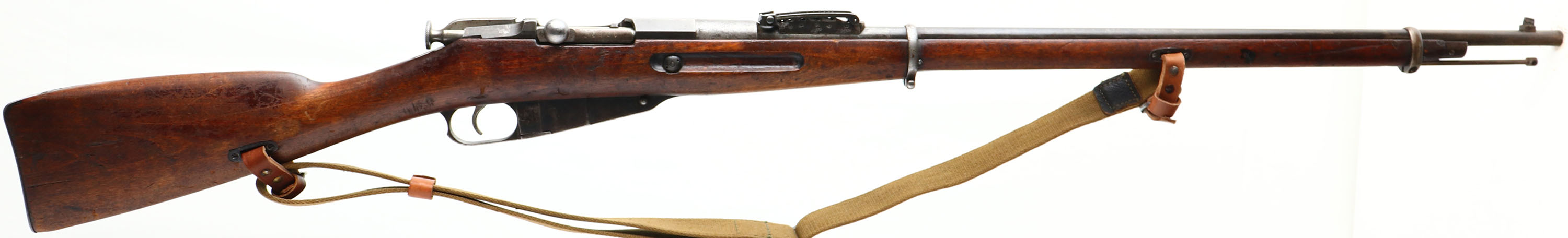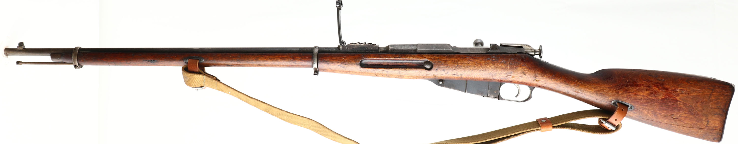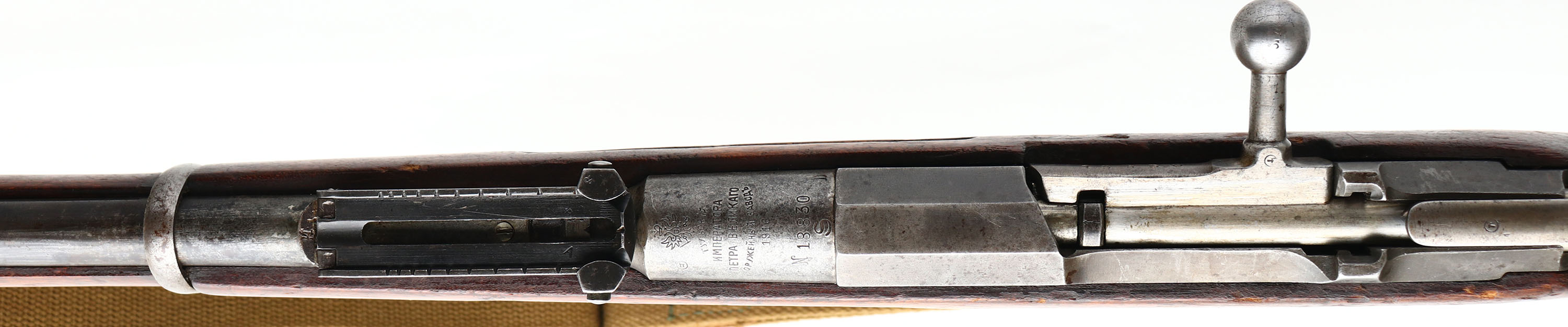 Tula, Model: M1891, Cal: 7.62x54mmR, MFG: 1916, S/N: N18830, bolt action rifle, 31 3/4'' barrel. The straight wrist wood stock is good with various nicks, ding, scratches, & wear from use/age. Faint Tula ''Hammer'' cartouche on right cheek of stock dated ''190?''. The metal finish 35 % overall, with a even thinned & worn bluing on the entire rifle. Top of the barrel is marked with the Tula Peter the great roll stamp, which started in 1912 to celebrate Tula's 200th year, ''1916'', S/N, ''S'' & other proof marks, left side of the barrel is marked with a ''SA'' in box stamp which indicates it was a Finnish captured rifle, which is pretty common for M1891 Mosin's, importer marks at end of barrel. S/N matched bolt. Bore is good, beginning to darken with lightly thinned rifling & roughness. Barleycorn front sight with the Konolavov rear sight marked with crossed out 4 to 12 on left side of base & 2 to 8 1/2 on right side of base, also 13 to 32 on back of ladder. Steel Butt plate worn gray with areas of patina & rust. Has dog collar canvas sling. Has cleaning rod. FFL or C&R Req. - Value: 400 to 800