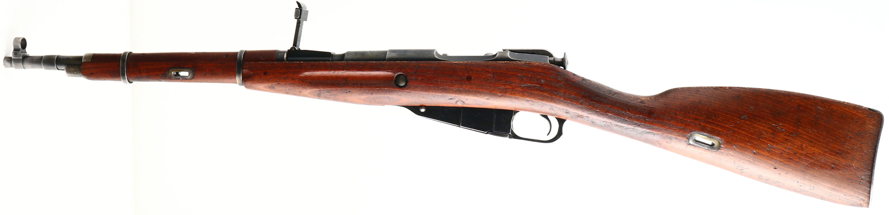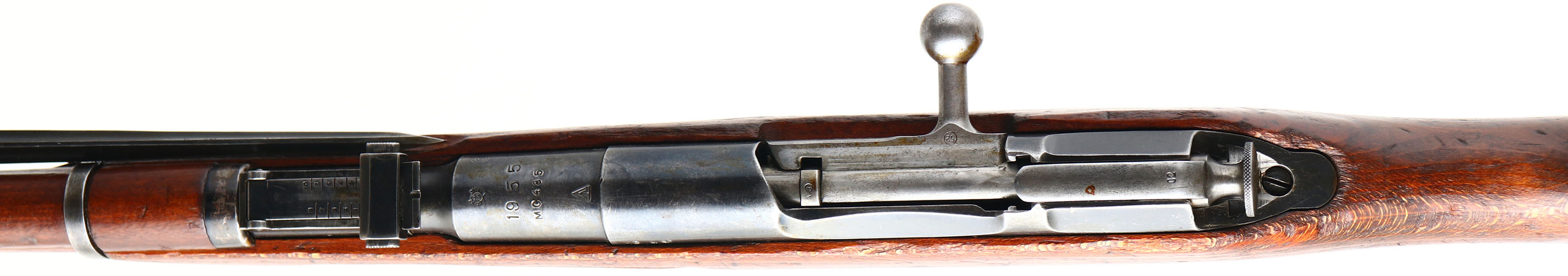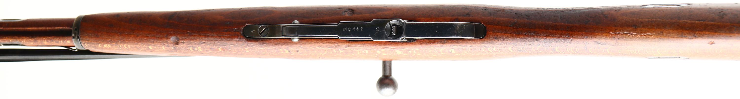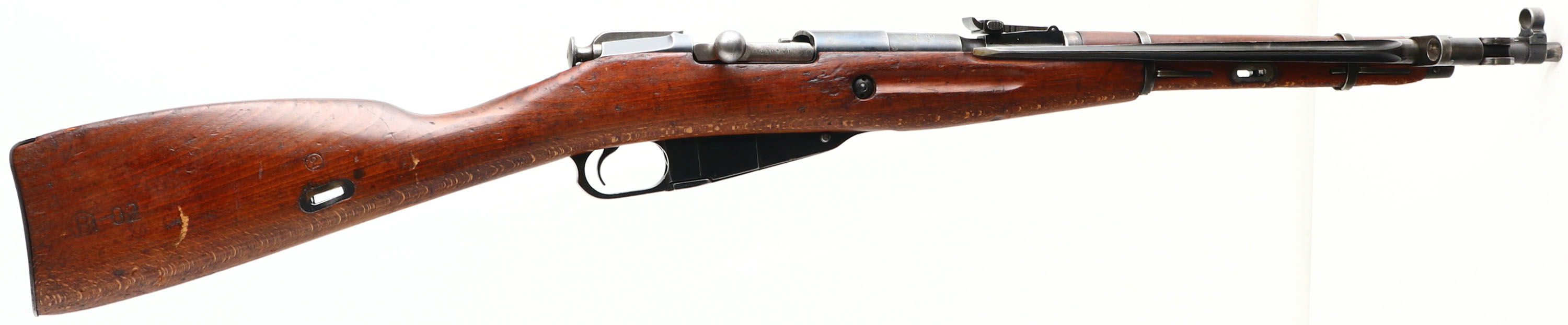 Cugir Arsenal (Romanian), Model: M44 (M53), Cal: 7.62x54mmR, MFG: 1954, S/N: MC485, Bolt action rifle, 20 1/2'' Barrel. The straight wrist wood stock is very good with light dings, dents & scratches from use/age, ''B'' in circle, & ''02'', cartouches on right cheek of stock, ''2'' in circle cartouche on right side of stock above sling well, stock carries both Romanian & Hungarian markings. The metal finish rates 70% overall with areas of thinned bluing. Left side of receiver is stamped with S/N, top of barrel is marked ''RPR'' in wreath, ''1955'', S/N, arrow in triangle, & other proof marks, left end of barrel is marked with importer stamps, S/N mismatched bolt & butt plate, S/N matched magazine floor plate, the mismatched bolt is common since Romanian M44's were mostly made from refurbished rifles/parts. Bore is good, bright with thinned rifling. Post front sight with protective globe, Tangent U-notch rear sight marked 1 to 10. steel butt plate with small nicks & wear. Missing the cleaning rod, side folding bayonet. one of the rarer Mosin variants produced with 70,000 units made in a 3 year span. FFL or C&R Req. - Value: 350 to 700