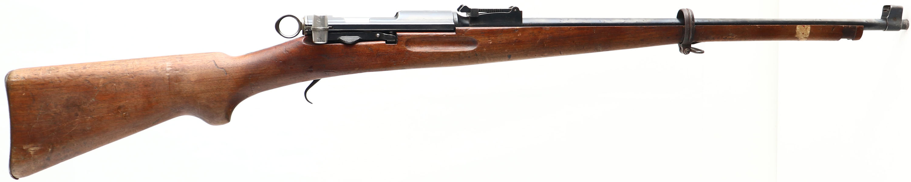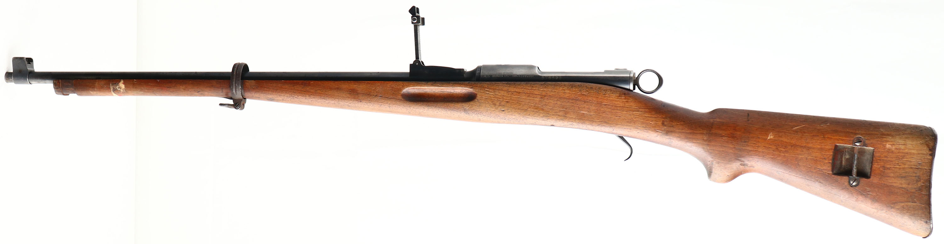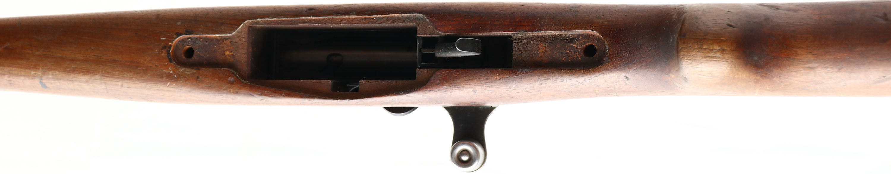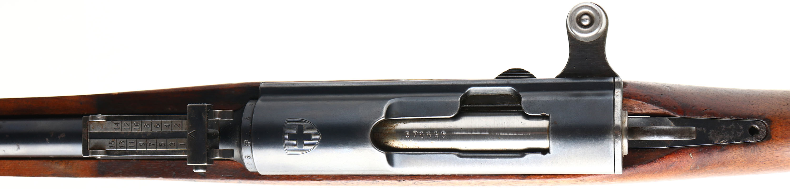 Waffenfabrik Bern (Swiss), Model: K31, Cal: 7.5x55 Swiss, MFG: 1938, S/N: 576695, Bolt action straight pull rifle, 26'' barrel. The Semi-Pistol grip wood stock is very good with small nicks, dings, dents, scratches, gouges, & wear from use/age, stock is missing the upper handguard & both barrel bands, has incorrect rear barrel band. The metal finish on the barrel rates 65% with areas of rust & pitting, The metal finish on the receiver rates 85% with areas of light wear. Receiver is marked with the Swiss crest, Importer marks, & S/N, barrel is marked ''BP'', ''+'' over ''M'', Swiss cross, & ''695, Bolt is S/N matched, magazine & trigger guard/floorplate is missing. Bore is excellent, bright & mirror like. Blade front sight with tangent U-notch rear sight marked 5 to 15 on the base & 3 to 20 on the ladder. Steel butt plate with rust & patina. Side rear sling swivel. Would make a nice project gun or a nice parts gun. FFL or C&R Req. - Value: 150 to 300