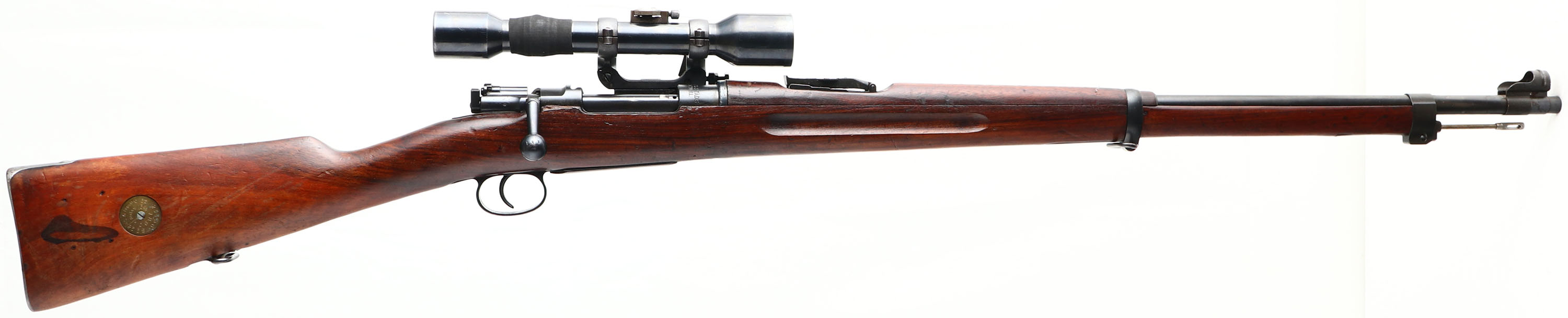 Carl Gustafs Stads Gevarsfaktori, Model: Gevar M1941B, Cal: 6.5x55mm, MFG: 1912, S/N: 306151, Bolt action rifle, 29 1/4'' barrel. The straight wrist wood stock is very good with light nicks, dings, scratches & stains, brass bore/info disc embedded into right cheek of stock, four small screw holes from where a brass trajectory range plate was removed. Three crown proofs on bottom of wrist. The blued metal finish rates 95% on the receiver & 85% on barrel with some light rust & thinning. Top of receiver is marked with a crown over a Swedish latter, ''''CARL GUSTAFS STADS GEVARSFAKTORI'', ''1912'', left side of the pined in scope mount is marked with S/N, scope mount is marked with S/N, & ''72''. S/N matched bolt, scope mount, barrel bands, & butt plate. Bore is excellent, bright & mirror like with strong rifling, has only a few small spots of light roughness. Barrel holds a wide wedge front sight with add on hood, rear sight is the updated SM Sikte F-ram sight for the newer boat tail ''Torped'' ammunition, sight is dated 1955, rear sight is a twist knob U-notch marked 1 to 6, rifle also has the original AJACK 490 scope, scope is marked on the knob base ''Nn1683/1941B''. stock carries a steel butt plate, has patina & cleaned pitting. Bottom sling loops. Has cleaning rod. Comes with original scope carrying case & orginal scope lens cover. In 1941 Sweden adopted a sniper rifle for its military & for the sniper rifles they would take the best shooting M1896 rifles they had & would drill & tap the receiver & mount a scope, & then add a bent bolt handle so they could actually cycle the rifle, this new rifle would be designated the M1941. Then in 1955 the Swedish Government refurbished all the snipers they still had in inventory to a new pattern the M1941 B where they changed the rear iron sight, & fixed a few quality of life issues with the scope mounts like adding the S/N to the side, adding stop screws to prevent over tightening, & peening in the locking screws on the mount, they also got rid of the older M/44 telescopic sight if it had it & made sure all rifles had the AJACK 4x90 scope. Overall a really nice condition Swedish sniper rifle from WW2. FFL or C&R Req. - Value: 2000 to 4000