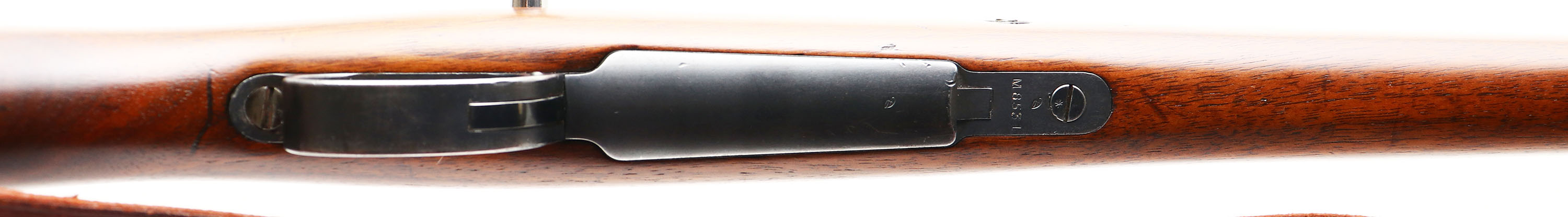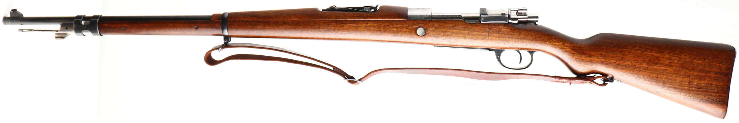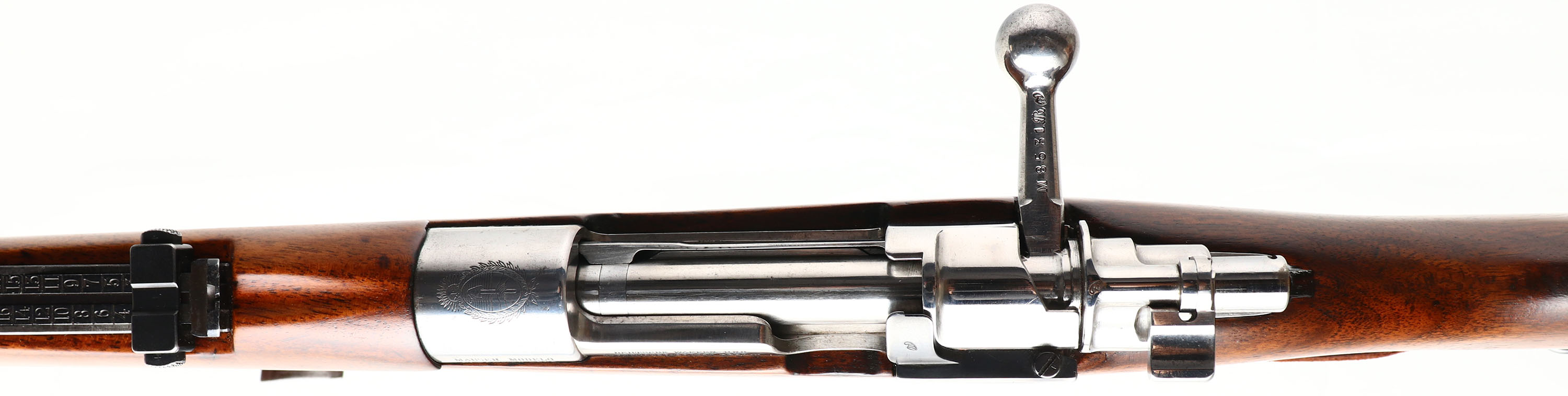 DWM, Model: 1909 Argentine, Cal: 7.65x53mm Mauser, MFG: 1911, S/N: M8531, Bolt action Rifle, 29'' barrel. The original semi-pistol grip wood stock is excellent with only minor dings/dents, faint cartouches on right side of stock by cheek, one faint cartouche on top of handguard Infront of rear sight, S/N marked into right side of stock below S/N on receiver. The metal finish on the barrel rates 75% with wear & spots of thinning, The receivers on these rifle were left in the white from the factory, the receiver has also been polished. Top of receiver is marked with the Argentina coat of arms, left side of receiver is marked ''MAUSER MODELO ARGENTINO 1909'', ''DEUTSCHE WAFFEN-UND'', ''MUNITIONSFABRIKEN BERLIN'', right side of receiver is marked with S/N, Bore is excellent, bright & mirror like with little to no wear. Barrel holds a barleycorn front sight with a tangent V-Notch rear sight marked 3 to 20. stock carries a steel butt plate with patina & light dings, bayonet lug is also chromed, comes with cleaning rod, original bayonet with sheath & frog, & two original stripper clips. FFL or C&R Req. - Value: 400 to 800