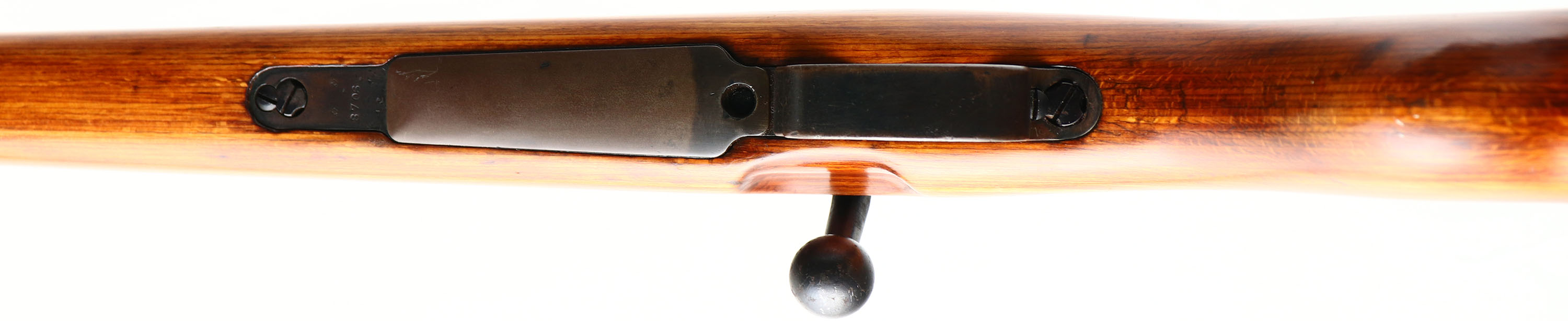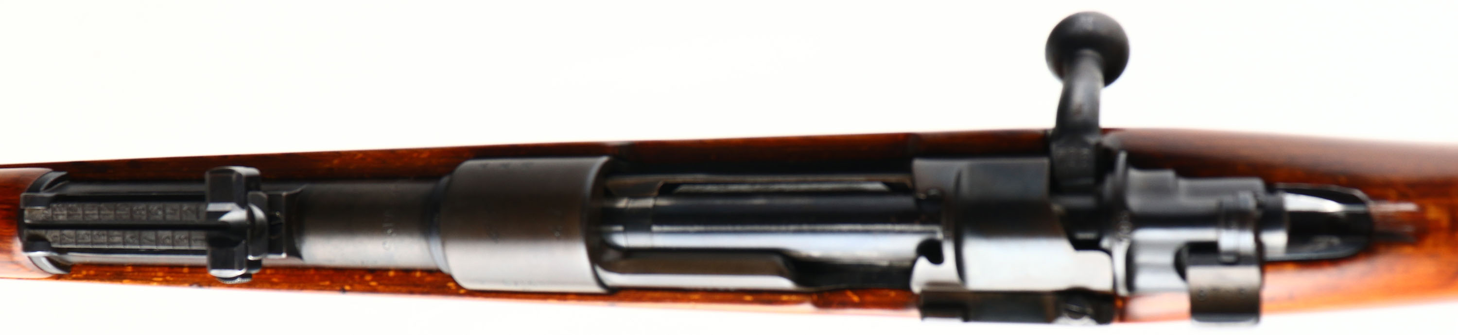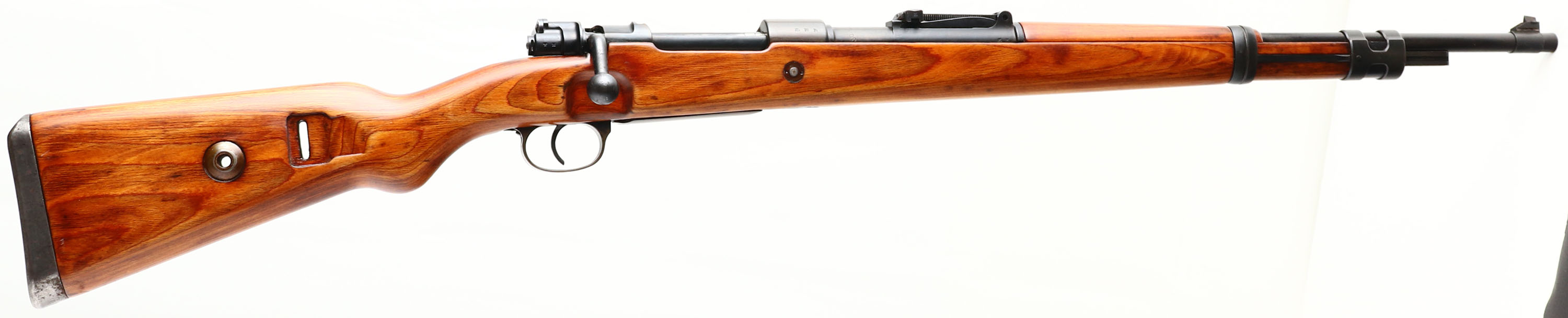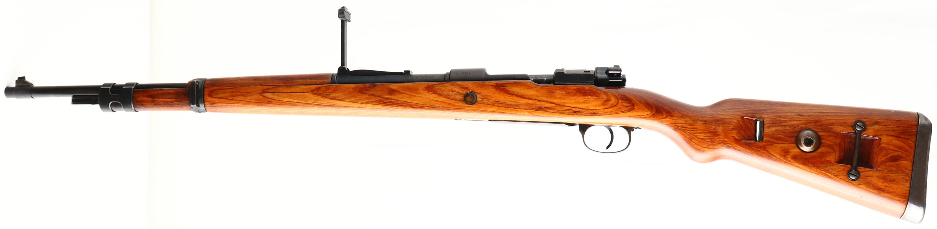 J.P. Sauer, Model: K98K, Cal: 7.92x57mm, MFG: 1941, S/N: 8705M, Bolt Action rifle, 23 3/4'' barrel. The semi-pistol laminated wood stock is very good, stock is a after war French modified one with a left side sling bar for use with the French slings, stock has been sanded & a high gloss finish has been added, stock has a firing pin disassembly disc through rear of stock. The metal finish rates 50% on the receiver & 85% on the barrel with most thinning on common hand/wear spots, this finish was likely redone by the French when they re-arsenaled this rifle after the war as the original German finish's were notorious for being easily worn off from just common use. Left side of receiver is marked with a Waffenamt proof mark, S/N, & ''Mod.98'', top of receiver is marked a script ''ce'' & ''41'', right side of receiver is marked with German proofs, left side of barrel is marked with a Waffenamt proof mark & S/N, top of barrel is marked ''S5179541DS'', S/N matched bolt & all its components, trigger guard/magazine, butt plate & both barrel bands, S/N mismatched rear sight. Bore is very good, bright with roughness throughout. Barrel holds a barleycorn front sight with a tangent V-notch rear sight marked 1 to 20 on ladder. Stock carries a steel cupped butt plate with wear & rust speckling. Side sling loop/bar/well. Missing cleaning rod. This rifle was refurbished & used by the French after the war evident by the modified stock to use French slings, it was used either in their military or more likely by police forces. FFL or C&R Req. - Value: 800 to 1600