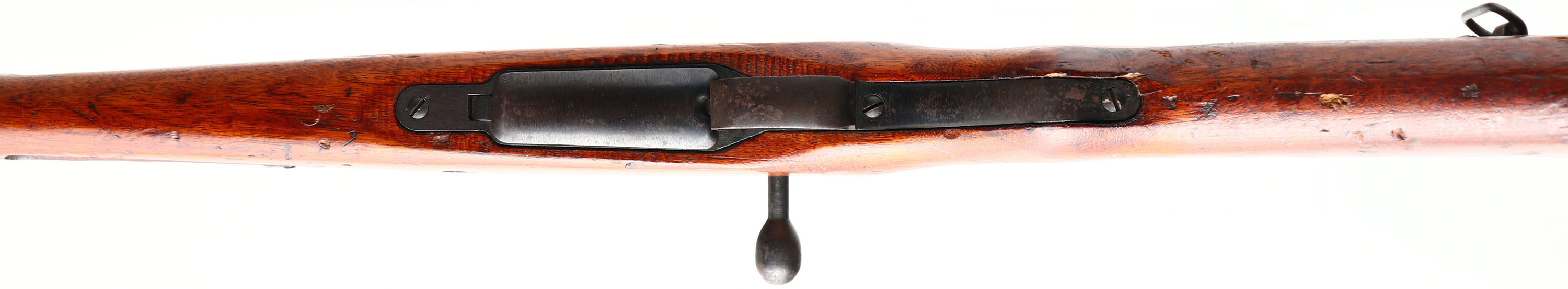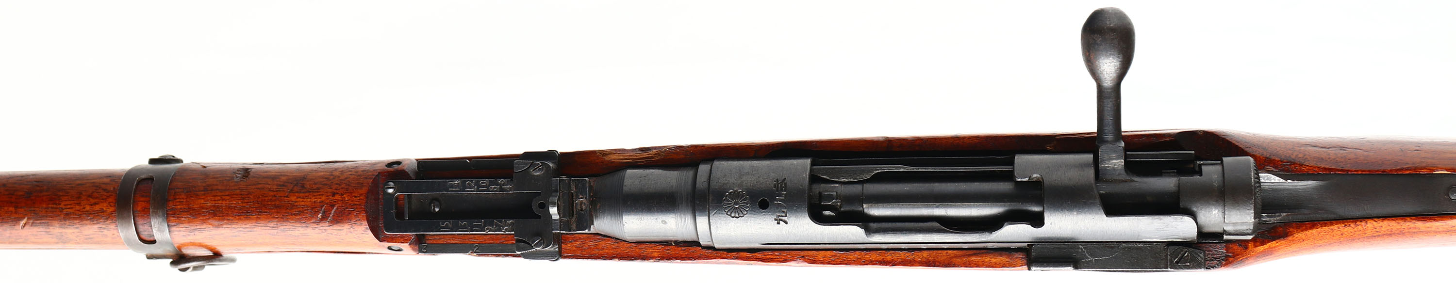 Nagoya Arsenal, Model: Type 99, Cal: 7.7x58mm, MFG: 1939-1945, S/N: 64976, 5th series, Bolt Action Rifle. 25 1/2'' Barrel. The semi pistol grip wood stock is very good with small nicks, dings, scratches, & wear from use/age, stock retains nice original color, small chip in top of finger groove of right side of stock, 2'' tight repaired crack on right side of stock by bolt handle. The metal finish rates 85% overall with rust speckling in spots & light scratches. Left side of receiver is marked with S/N, arsenal stamp, top of receiver is marked with a RARE intact chrysanthemum & ''Type 99'' In Japanese, S/N MATCHED bolt. Bore is very good Near excellent, bright & shiny with little to no wear. Barleycorn front sight, Aperture Ladder rear sight marked 3 to 15, Has folding anti-aircraft sight wings & are marked 2 to 3. Metal Butt plate with wear & brown patina. Side sling swivels, has cleaning rod. Comes with a rare monopod. a nice example of a vet bring back Type 99. FFL or C&R Req. - Value: 300 to 600