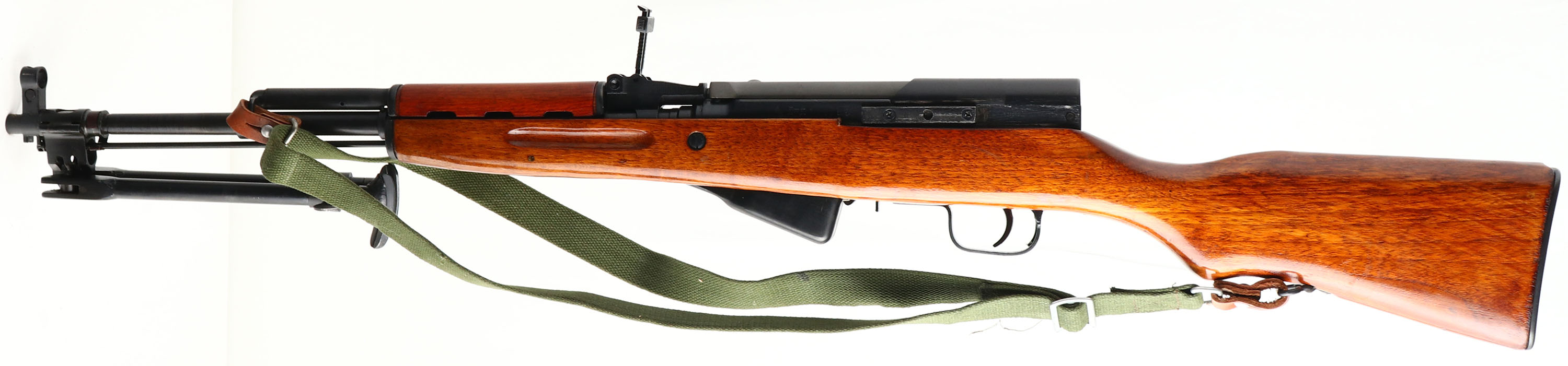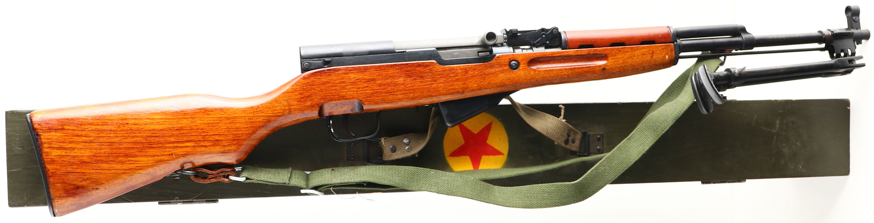 Chinese Factory 106, Model: Type 56, Cal: 7.62x39, MFG: 1966-67, S/N: 111188, Semi-auto Rifle, 20 3/8'' Barrel. The semi-Pistol grip wood stock is very good, stock appears to have been sanded & re-finished, stock is for the earlier blade bayonet & the bayonet channel has been filled in with a plug of wood,. The metal finish rates 90% on the barrel with light wear, & rates 85% on the receiver with one spot of thinning, & has light scratches. Left side of receiver is marked with triangle Factory stamp, ''TYPE 56 CARBINE'' in Chinese, S/N, & importer markings, Bolt, magazine, & trigger guard are all S/N matched. Bore is Excellent, bright & mirror like. Hooded post front sight, tangent U-notch rear sight marked 1 to 10, has a AK cope rail mount to left side of receiver that will take any standard Ak optics or rails, also comes with a fixed 4x scope marked ''4X-20'' on side, has a Mosin PU style recital. Steel trapdoor Butt plate with full cleaning kit inside. Has cleaning rod. Bayonet has been removed & the lug is gone entirely. One bottom & one side sling mount, comes with period correct green canvas sling, bipod, 20 rounds of surplus 7.62x39 ammo on clips, & Home made green wooded crate for rifle, mimics a original factory shipping crate but is for just one rifle. FFL or C&R Req. - Value: 400 to 800