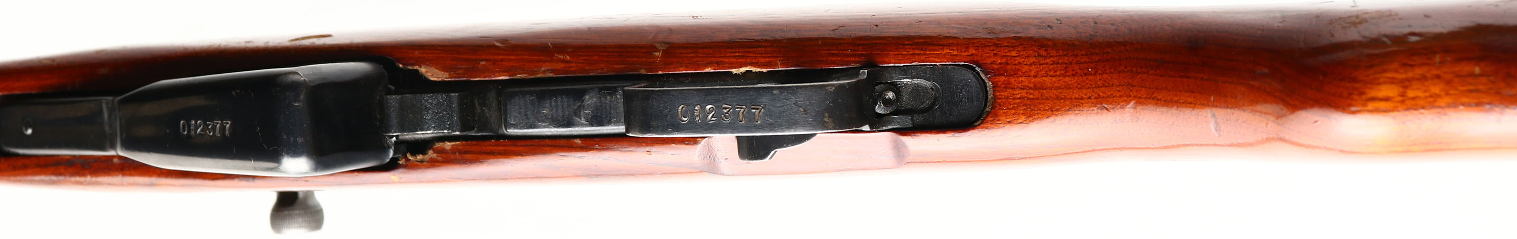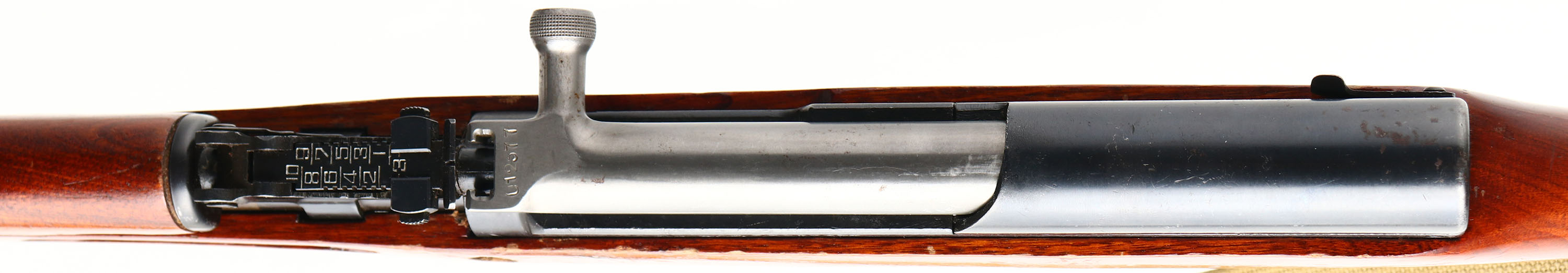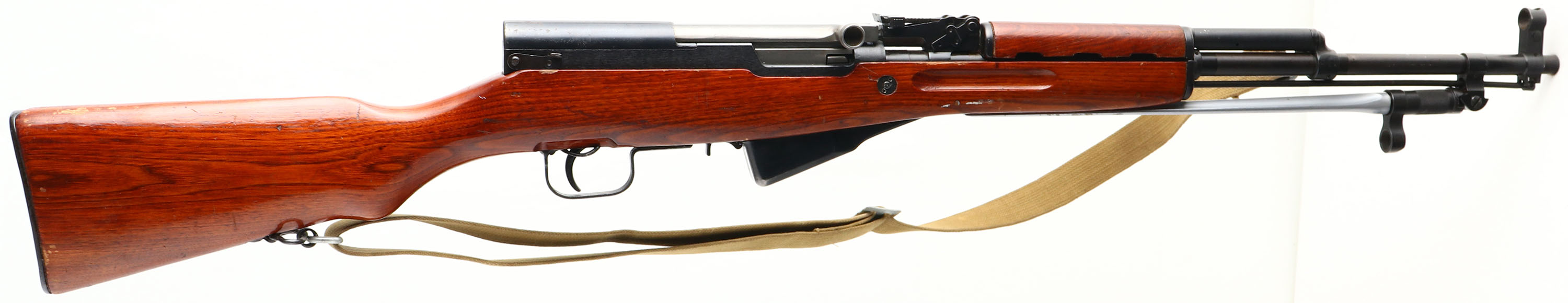Chinese Factory 0223, Model: Type 56, Cal: 7.62x39, MFG: 1980, S/N: 25012377, Semi-auto Rifle, 20 1/2'' Barrel. The semi-Pistol grip wood stock is very good with light nicks, dings, scratches, & wear, from use/age, stock has a high gloss finish added to it, S/N stamped into left side of stock by cheek. The metal finish rates 95% on the barrel with light wear, & rates 88% on the receiver with minor scratches & very light rust speckling. Left side of receiver is marked ''0223'' in triangle factory stamp, ''TYPE 56 CARBINE'' in Chinese, S/N, & importer marks, Bolt, magazine, & trigger guard are S/N matched. Bore is Excellent, bright & mirror like. Hooded post front sight, tangent U-notch rear sight marked 1 to 10. Steel trapdoor Butt plate with full cleaning kit inside, Butt plate has scratches & wear. One bottom & one side sling mount, has cleaning rod, comes with period correct canvas sling. FFL or C&R Req. - Value: 400 to 800