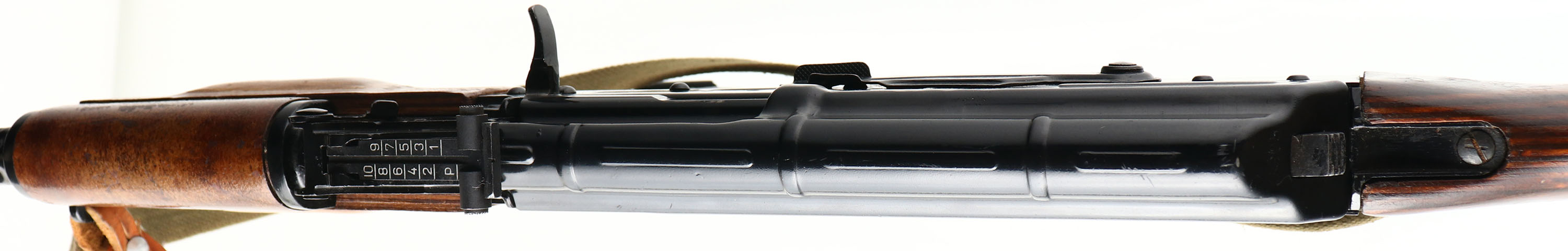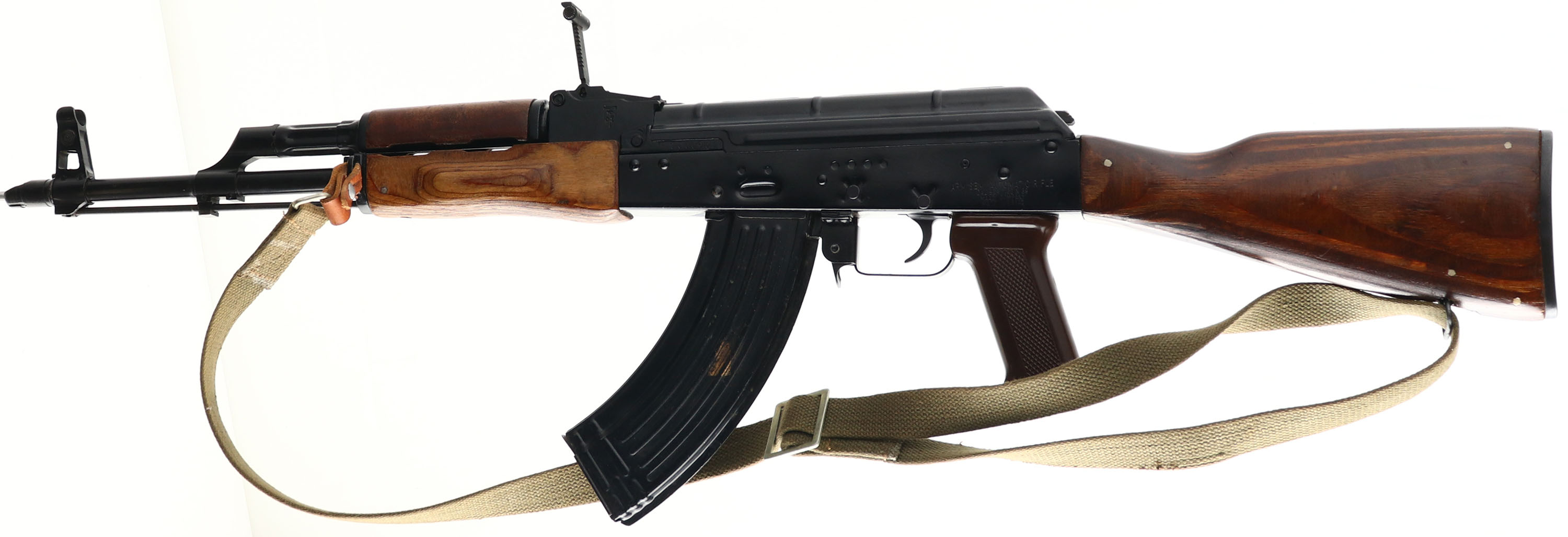 RARE PRE-BAN, MAADI (Factory 54) Model: ARM, Cal: 7.62x39mm, MFG: 1980's, S/N: S000905, Semi-auto rifle, 16 1/4'' threaded barrel. The laminated wood stock & handguard are excellent with only a few minor scuffs, lower handguard has some play back and forth, has a Bakelite plastic checkered pistol grip. The baked on black enamel metal finish rates 90% over all with minor scratches/wear. Left side of receiver is marked with S/N, ''ARM SEMI AUTOMATIC RIFLE'', ''CALIBER 7.62X39'', ''MAADI COMPANY'', ''MADE IN EGYPT'', right side of receiver is marked ''STEYR,SECAUCUS,N.J.'', left side of rear sight block is stamped with the MAADI Logo, right side of rear sight block is stamped with a ''Pharaoh's Crown'' crest. Bore is excellent, bright & mirror like. Barrel holds a adjustable post front sight with protective wings, Tangent U-notch rear sight marked 1 to 10. stock carries a steel trapdoor butt plate. Rifle has the cleaning rod & comes with a green canvas sling, also has the bayonet lug, reference lot # 5821 for more mags for this rifle. Only about 2000 of these rifle were imported before the ban making them quite rare. Also these Rifles are almost a exact Semi-auto duplicate of the Russian AKM, other that the rear sight markings being pushed to 1000 Meters instead of 800 & the Bakelite plastic pistol grip rather than a wood, & is about as close as you can get on the U.S. market to a real Russian AKM. FFL Req. - Value: 1000 to 5000