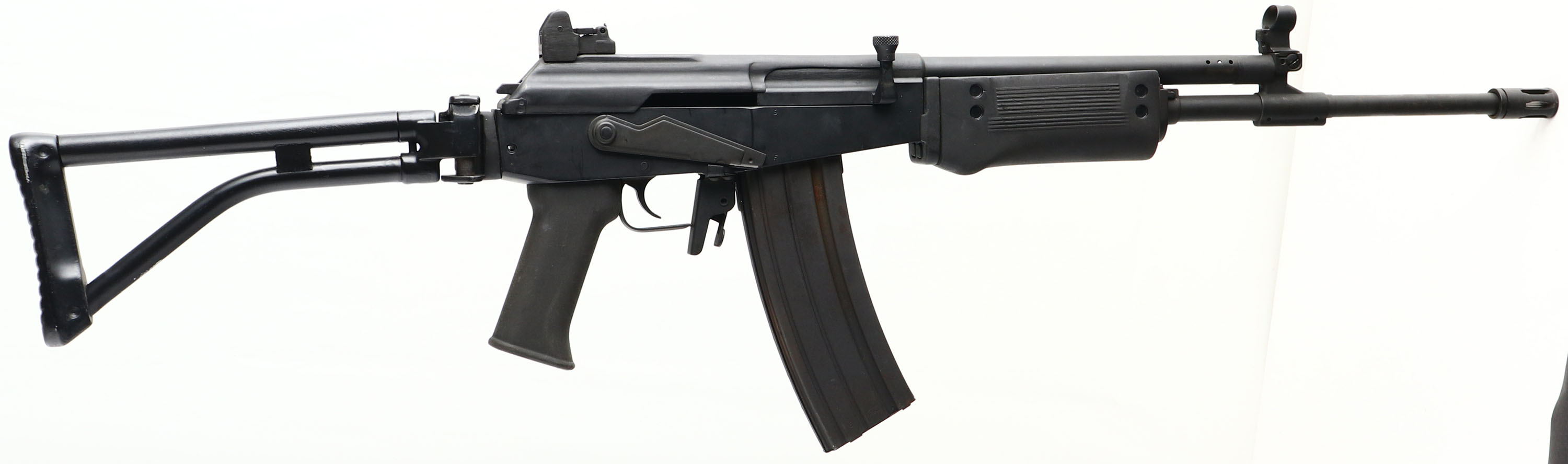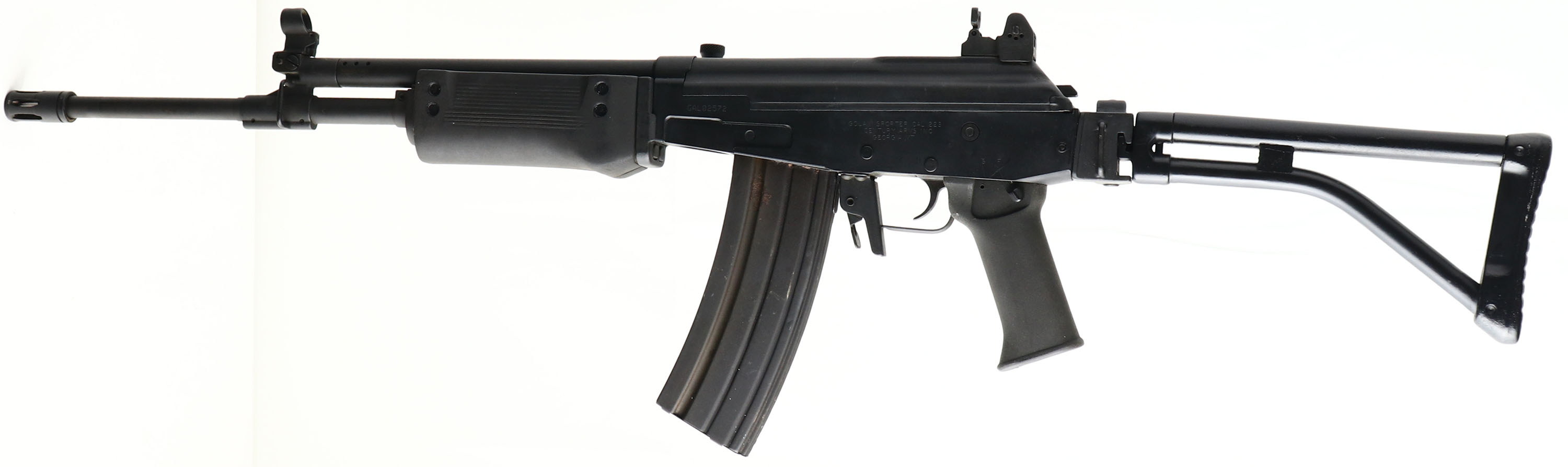 Century Arms, Model: Golani Sporter, Cal .223/5.56, MFG: 1980's-90's, S/N: GAL02572, Semi-auto rifle, 18'' barrel. The metal folding stock & polymer handguard/pistol grip is excellent with minor wear. The metal finish rates 90% overall, with light wear/scratches. Left side of receiver is marked with S/N, ''GOLANI SPORTER CAL .223'', ''CENTURY ARMS INC.'', ''GEORGIA, VT''. Bore is excellent. Hooded post front sight with flip up night post, rear 2 position aperture rear sight with flip up night sight. Stock carries a cast grooved butt plate. Side sling bars, comes with one 35Rd mag, reference lot #'s 5818, 5819, 5820, for extra mags for this rifle. A nice American made copy of the Israeli classic Galil rifle. FFL Req. - Value: 600 to 1200