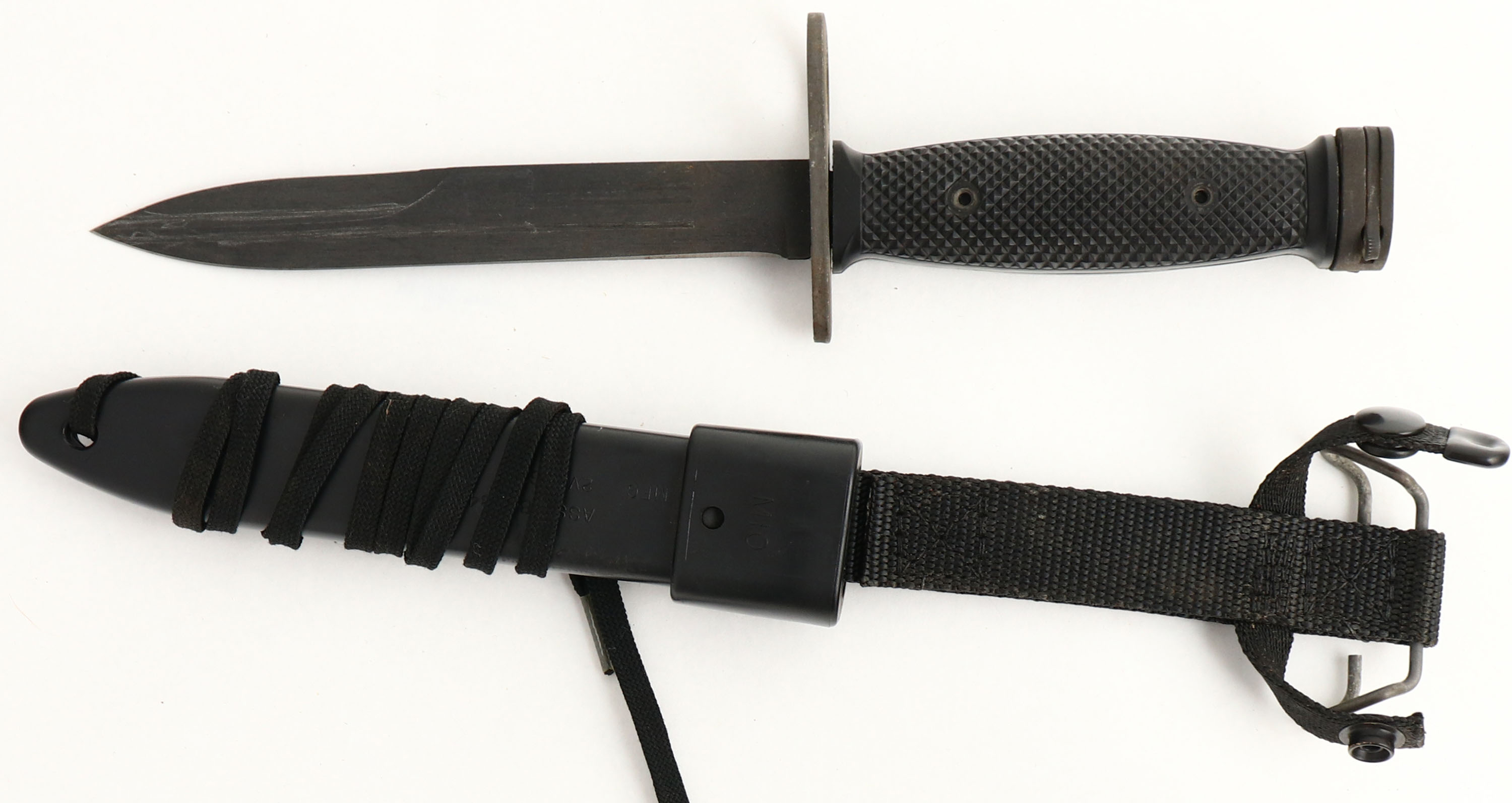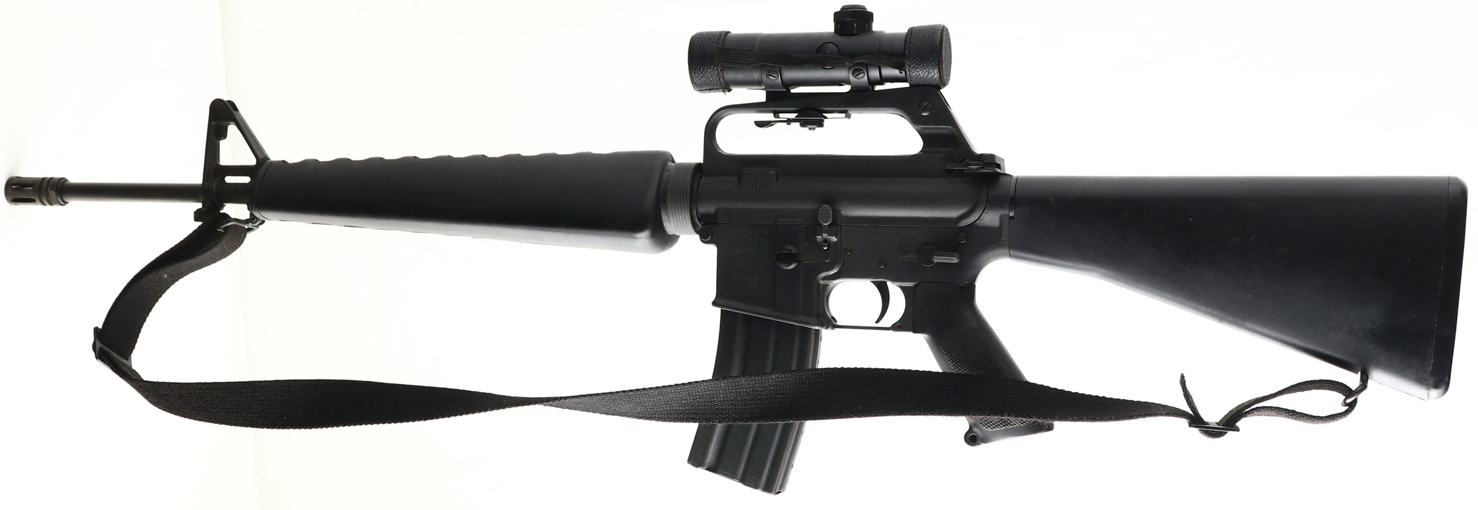 Colt, Model: AR-15 SP1 Pre-ban, Cal: .223, MFG: 1979-93, S/N: SP204887, Semi-auto rifle, 20'' barrel. The polymer stock, handguard & pistol grip are very good with light scratches. The metal finish rates 90% overall with light wear & scratches. Left side of receiver is marked with the rampant colt in circle logo, ''COLT'', ''AR-15'', CAL: .223'', ''MODEL: SP1'', S/N, ''COLT'S FIREARMS DIVISION'', ''COLT INDUSTRIES'', ''HARTFORD, CONN.'', ''U.S.A.'', top of barrel is marked ''C MP CHROME BORE''. Bore is excellent. Barrel holds a post front sight with protective wings, carry hand has a 2 position aperture rear sight, also comes with a colt 3X scope that mounts to carry handle, scope is marked ''COLT'', ''3 x 20''. Stock carried a plastic, checkered trapdoor butt plate. Bottom sling loops. Comes with black nylon sling, bayonet with sheath, & one 30 Rd. mag. A excellent example of the early Colt AR-15 with some nice accessories. FFL or C&R Req. - Value: 1500 to 3500
