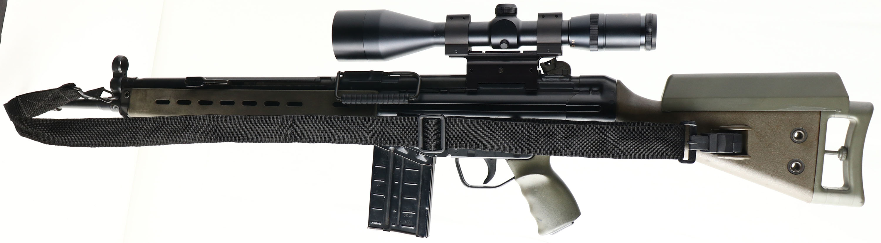 Heckler & Koch, Model: HK 91, Cal: .308, MFG: 1990's, S/N: A022178, Semi-auto rifle, 20 1/2'' barrel. The polymer stock, handguard & pistol grip are excellent with minor wear. The metal finish rates 90% overall with light wear. Left side of mag well is marked ''HK91'', S/N, & proof marks, right side of mag well is marked ''Made in Germany'', ''HK Inc.'', ''Arl. Wa 22 201'', '' Kal. .308''. Bore is excellent, bright & mirror like. Rifle has a hooded post front sight with a elevation adjustable aperture rear sight, rifle is also mounted with a Springfield armory 1st generation government 4x14x56 scope. Grooved plastic butt pad. Side sling mounts. Rifle comes with one 20 Rd magazine, bayonet with incorrect US sheath/frog, & a black nylon sling, reference lot #'s 5815, 5816, 5817 for extra mags for this rifle. FFL Req, - Value: 1800 to 4000