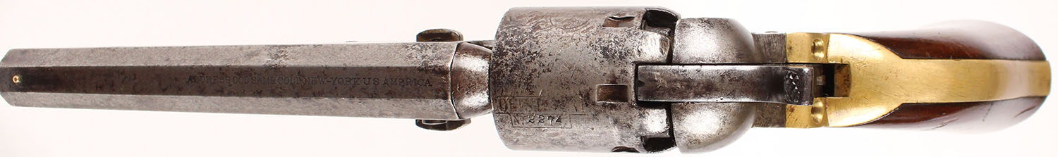 Colt, Model 1849 Pocket, CAL: 31, MFG: 1867, SN: 292274, Single Action Percussion Revolver, 5'' octagon barrel. The top barrel is stamped ''ADDRESS COL SAML COLT NEW-YORK U.S. AMERICA'' & the right side of the frame is stamped ''COLTS PATENT'' in two lines. Clear caliber marking on the left side of the trigger guard. All matching SN on the barrel, frame, cylinder trigger guard, butt, wedge & arbor. The original wood grips are very good & solid. There are contusions, scrapes & dings to the finish, with some darkening on both grips near the frame. The metal finish has worn to a mix of metal gray & spotting toned to a brown patina. The brass trigger guard & backstrap have a thin aged patina, with some scrapes & dings. Bore is good, consistently rough with intermittent pitting amongst proud rifling. Small brass bead front sight. Antique, No FFL Req. - Value: 500 to 1000