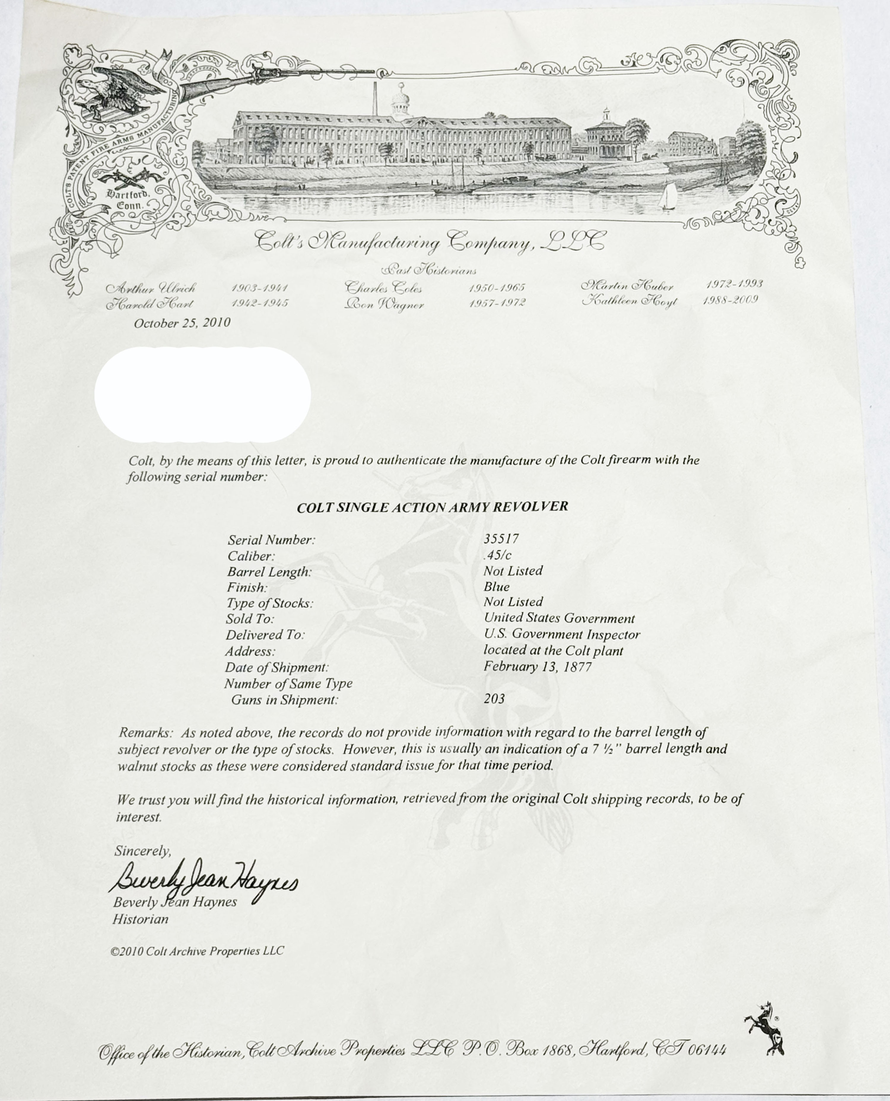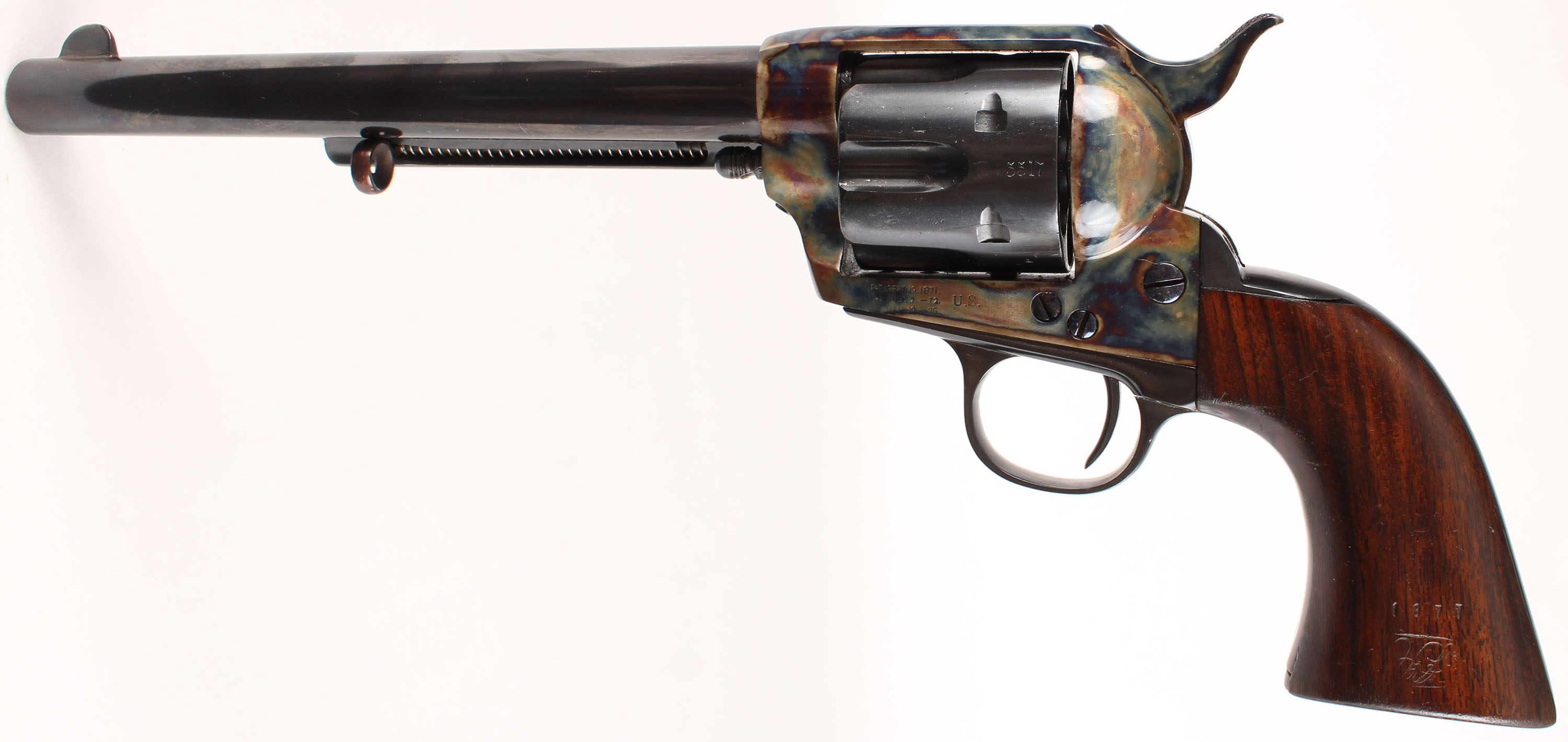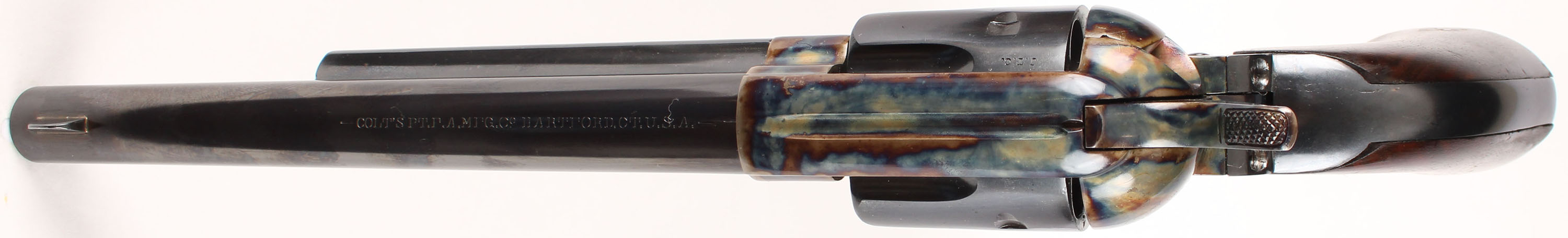 Colt, First Gen Single Action Army U.S Marked, CAL: 45 COLT, MFG: 1877, SN: 35517, Single Action Revolver, 7 1/2'' barrel. This gun has been fully & professionally restored. All matching SN on the butt, trigger guard, frame & cylinder. The inspector initials ''J.T.C'' can be found on the frame above the SN, bottom of barrel & cylinder. There are two cartouches on the left grip, ''1877'' over an upside-down cursive ''JH'' cartouche in a square. The right grip has the same right side up cursive ''JH'' cartouche. The cartouches are thin from the grips being refinished, but are still very legible. The top of the barrel has a one line address ''COLT'S PT. F. A. MFG CO HARTFORD, CT. U.S.A''. The left side of the receiver has a two line patent date ''PAT.SEPT.19.1871, JULY2.72, JAN.19.75'' & a ''U.S'' marking. The markings on the frame appear thin. The cylinder has a partial matching SN. The full SN can be found on the frame. The original wood grips are excellent, having been lightly sanded & refinished. The metal blue finish on the barrel & cylinder rates 97%. The case-hardened receiver & hammer display bright case colors. Bore is excellent, with mirrored appearance. V-notch rear groove & tall blade front sight. Comes with a Colt Factory letter. The records on this revolver do not provide the barrel length or type of stock, they label it as ''Not Listed'', however there is a ''Remarks'' paragraph below the record that states: ''As noted above, the records do not provide information with regard to the barrel length of revolver or the type of stocks. However, this is usually an indication of a 7 1/2'' barrel length and walnut stocks as these were considered standard issue for that time period.''. This revolver still presents excellently having been professionally restored. No FFL Req. - Value: 2000 to 6000