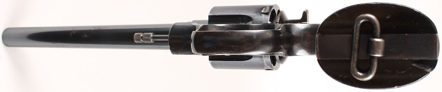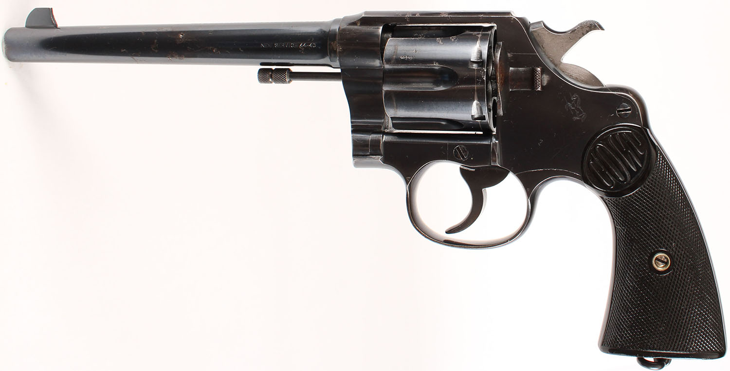 Colt, New Service Commercial Model, CAL: 44-40, MFG: 1922, SN: 316989, Double Action Revolver, 7 1/2'' barrel. The top of the barrel is stamped with two line address & patent dates. The left side of the barrel is marked ''NEW SERVICE 44-40'' & the left side of the frame displays a clear Rampant Colt. The original Colt marked checkered hard rubber grips are good. The right grip has an edge chip & a 2'' glue repaired crack, otherwise condition is very good. The metal blue finish rates 80% overall, with intermittent cleaned pitting & small areas worn to metal gray, toned to a thin brown patina. Bore is excellent. U-notch rear groove & large fin shaped blade front sight. Lanyard loop present. This example has the more desirable flat cylinder latch. FFL or C&R Req. - Value: 1000 to 2000