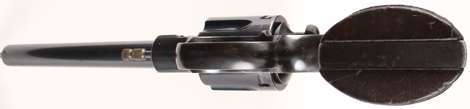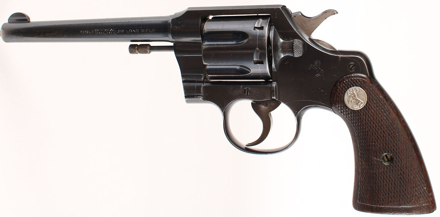 Colt, Official Police Pre-War, CAL: 22LR, MFG: 1939, SN: 13808, Double Action Revolver, 6'' barrel. The Colt logo medallion pre-war checkered walnut grips are very good & solid. There is consistent overall wear to the grips. Confirmed pre-war grips by the three stud holes visible on the reverse top of both grip panels. The original metal blue finish rates 85% overall, with spotting/speckling toned to a brown patina. Bore is excellent. Square notch rear groove & blade front sight. A desirable .22LR variation of an Official Police Revolver. FFL or C&R Req. - Value: 500 to 900