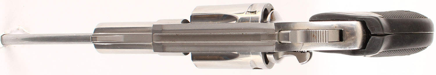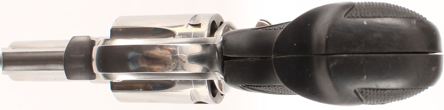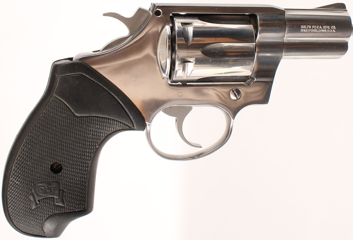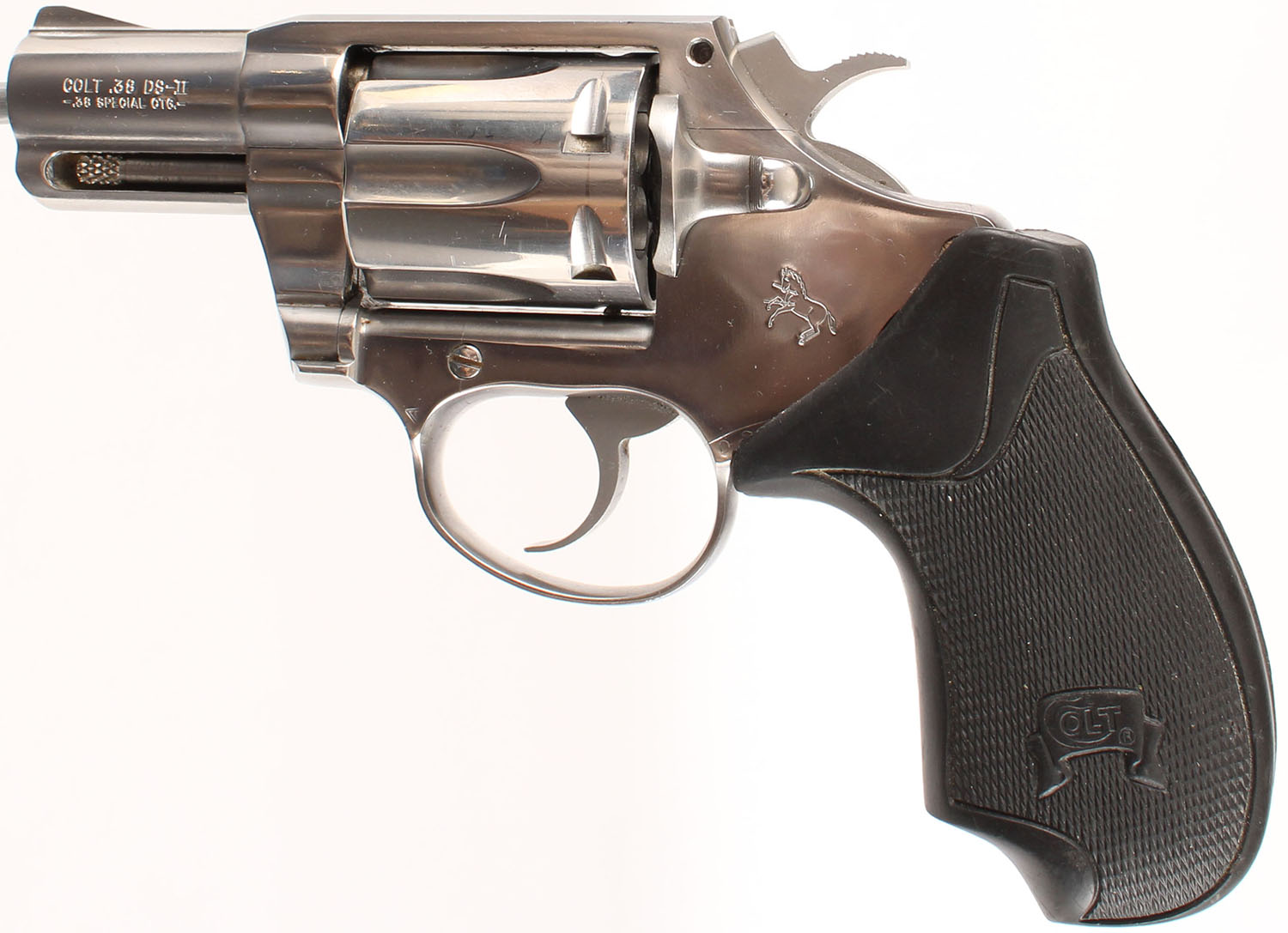 Colt, Model DS-II, CAL: 38 SPL, MFG: 1997, SN: 1821SV, Double Action Revolver, 2 1/8'' barrel. The Colt banner checkered rubber grips are very good, with overall wear from use. The nickel finish is excellent, with visible brush lines. Bore is excellent. Rear groove & blade front sight. The frame was tapped & drilled, with (3) open screw holes, most likely for a hammer shroud used for concealed carry purposes. Only made two years. FFL Req. - Value: 500 to 1000