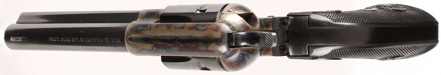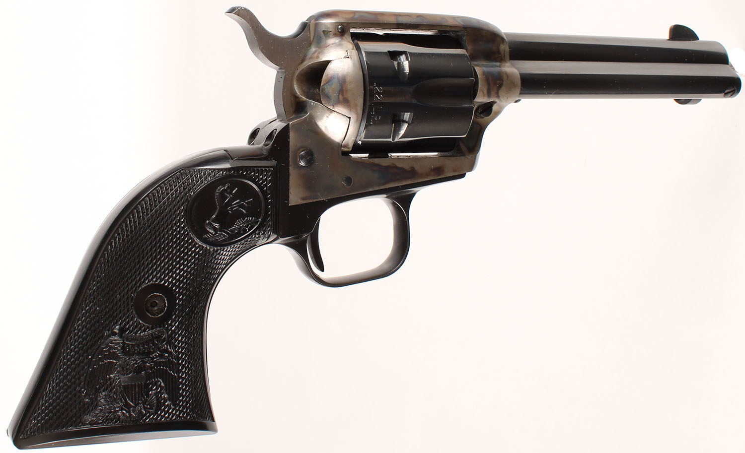 Colt, Peacemaker, CAL: 22 LR/22 MAG, MFG: 1974, SN: G112761, Single Action Revolver, 4 3/8'' barrel. The original E. Pluribus Unum & Rampant Colt checkered plastic grips are excellent. The metal blue finish on the barrel & cylinder rates 99%. The case-hardened frame displays vivid case-colors. The case-colors on the right side of the frame have slightly faded. Bore is excellent. Rear groove & blade front sight. Comes in the original Colt styrofoam packaging, no cardboard box. Included is the 22 MAG cylinder in original packaging. FFL or C&R Req. - Value: 600 to 1000