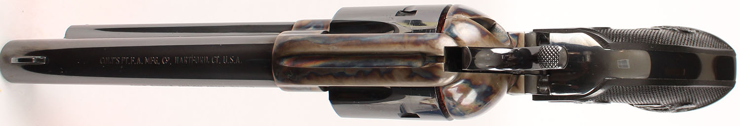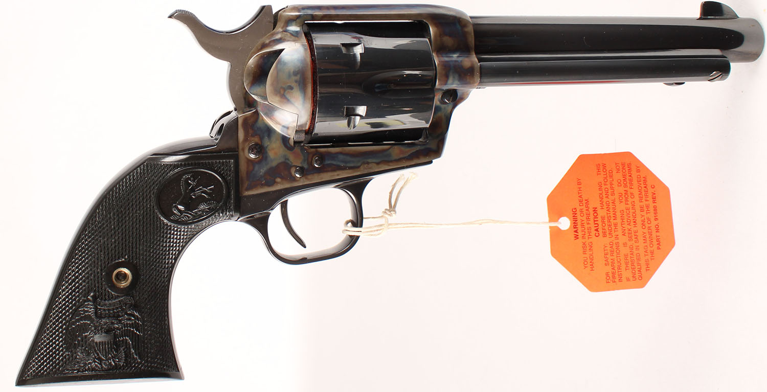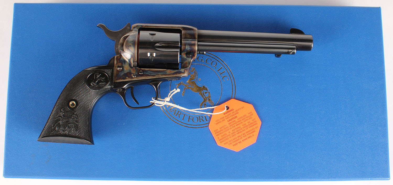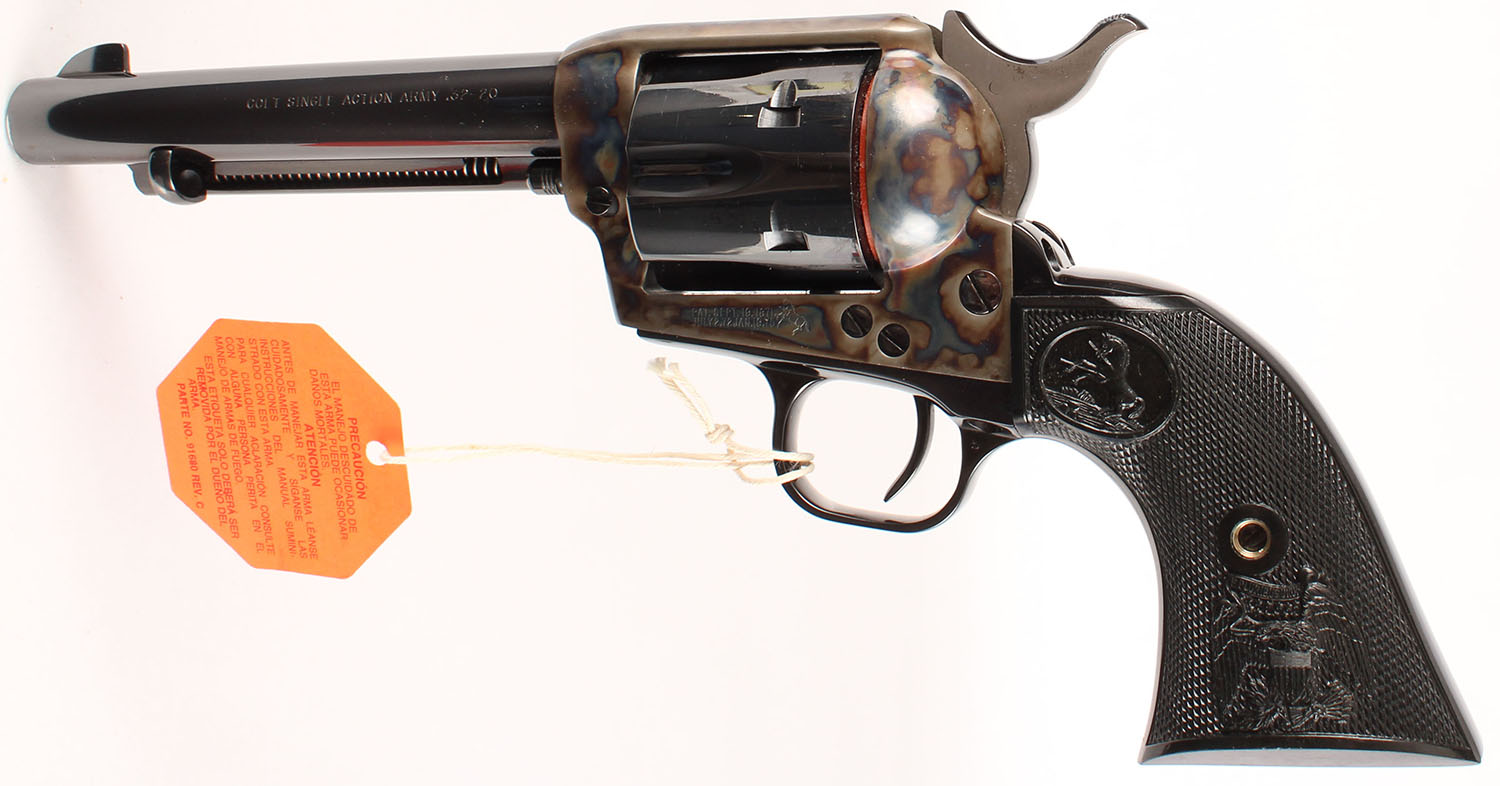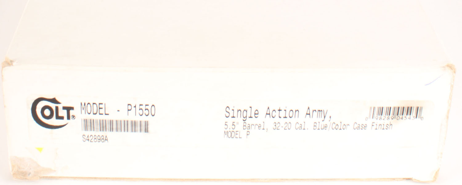 RARE, BOXED, Colt, SAA 3rd Gen (P1550), CAL: 32-20, MFG: 2006, SN: S42898A, Single Action Revolver, 5 1/2'' barrel. The top of the barrel is marked ''COLT'S PT F.A. MFG. CO. HARTFORD CT. U.S.A.''. The left side of the barrel is marked ''COLT SINGLE ACTION ARMY 32-20''. The left side of the frame is marked with the Rampant Colt logo above the trigger guard & next to patent dates. The full SN can be found on the bottom of the frame. The original Rampant Colt & E.Pluribus Unum Eagle plastic grips are excellent. The factory metal blue finishes rate 99%+. The case-hardened frame displays vivid case-colors. Bore is excellent & bright. Cylinder still has protective disc. Factory groove & blade front sight. Comes in the original factory Colt blue box, with outer cardboard sleeve. Included is hang tag, related paperwork, lock & original packaging. Box condition is excellent. FFL Req. - Value: 1500 to 2500