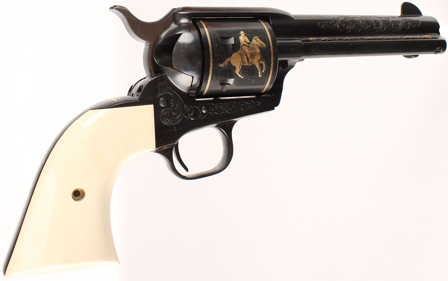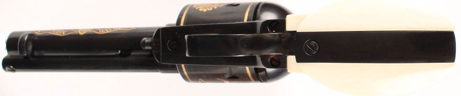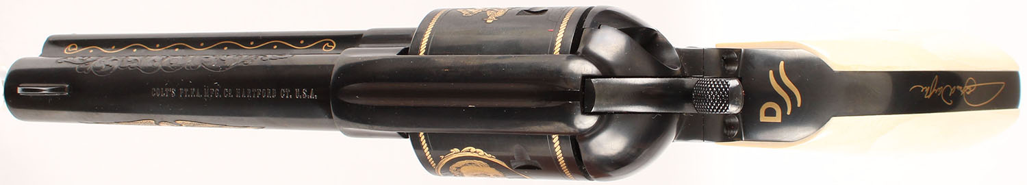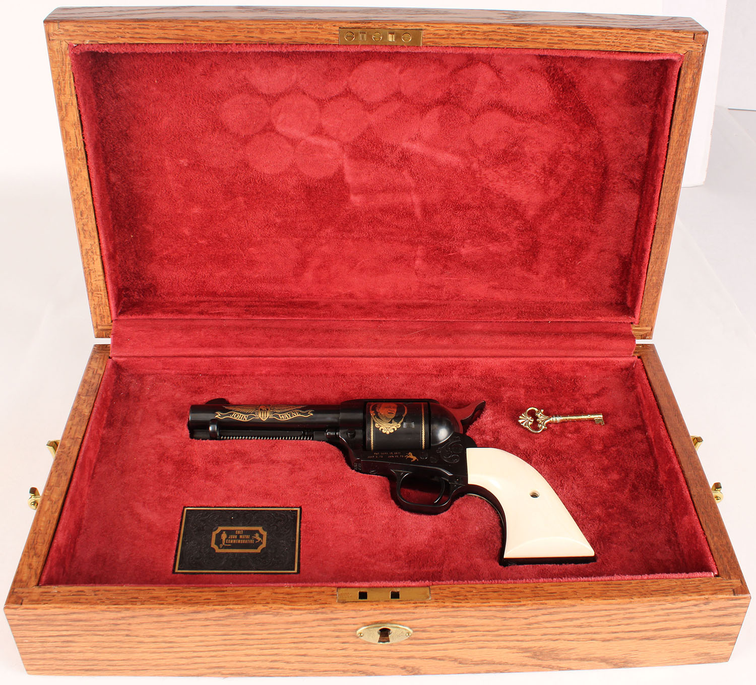 Cased Colt SAA John Wayne Commemorative, 45 LC Cal, Model John Wayne SAA, MFG: modern, SN: CJWC0198, Barrel 4 5/8'', smooth white grips are minty, engraved factory blue finish is mint, has gold engraved barrel, cylinder & receiver, NIB, wood case is red leather lined with gold key & plaque, great new old stock NIB. FFL Req. - Value: 2000 to 5000