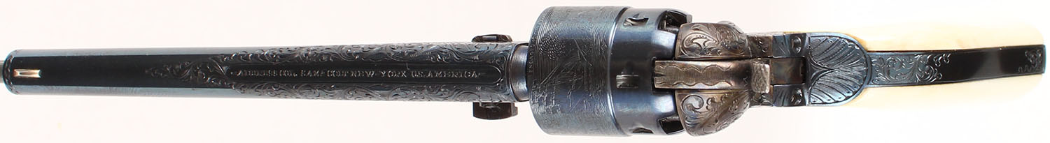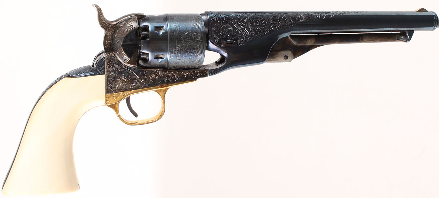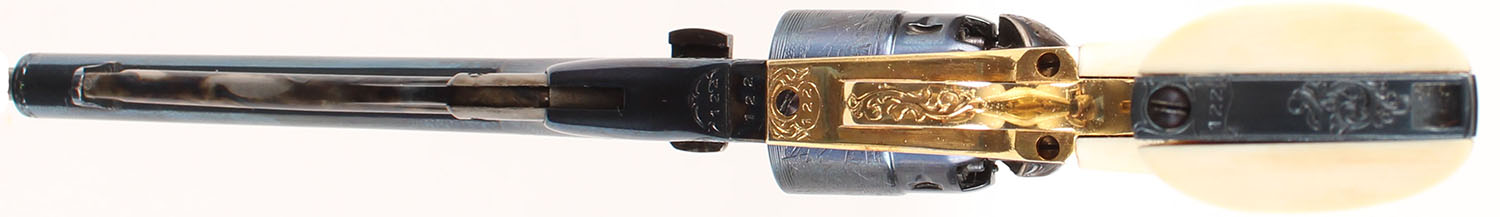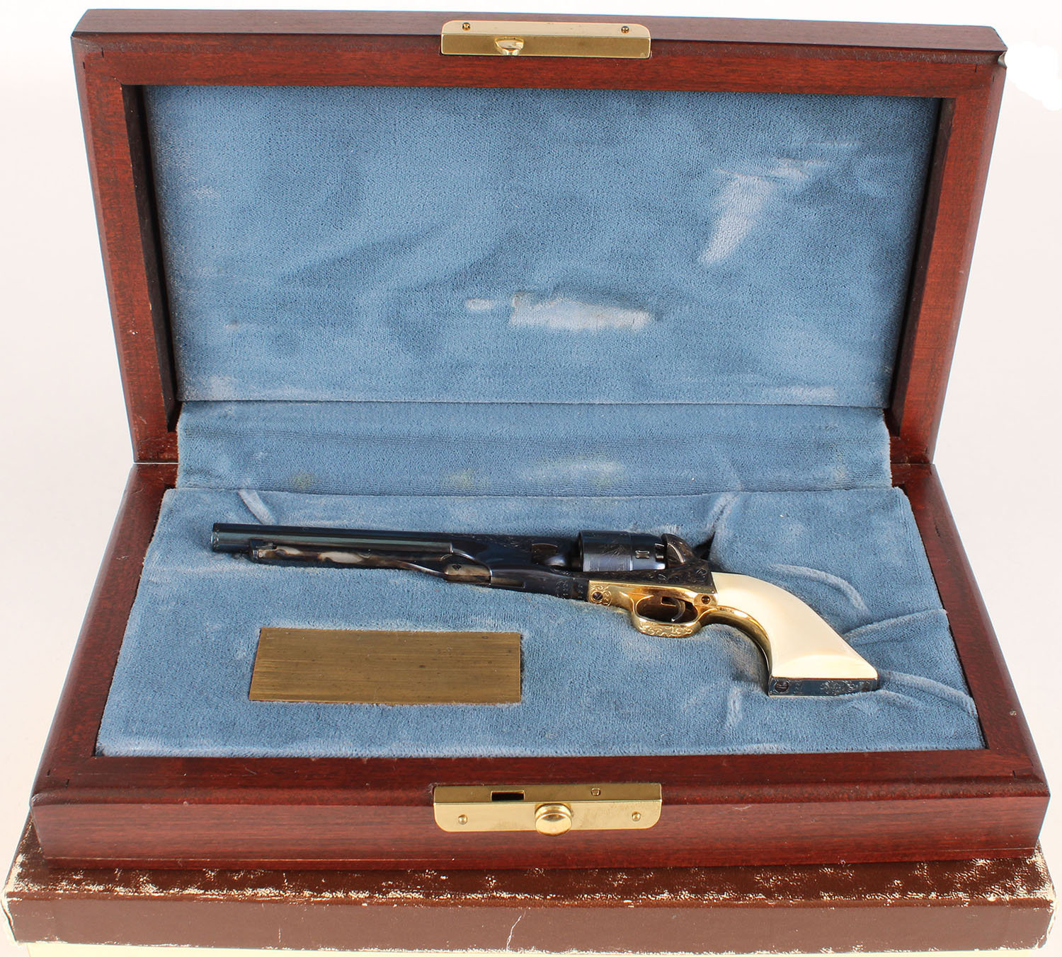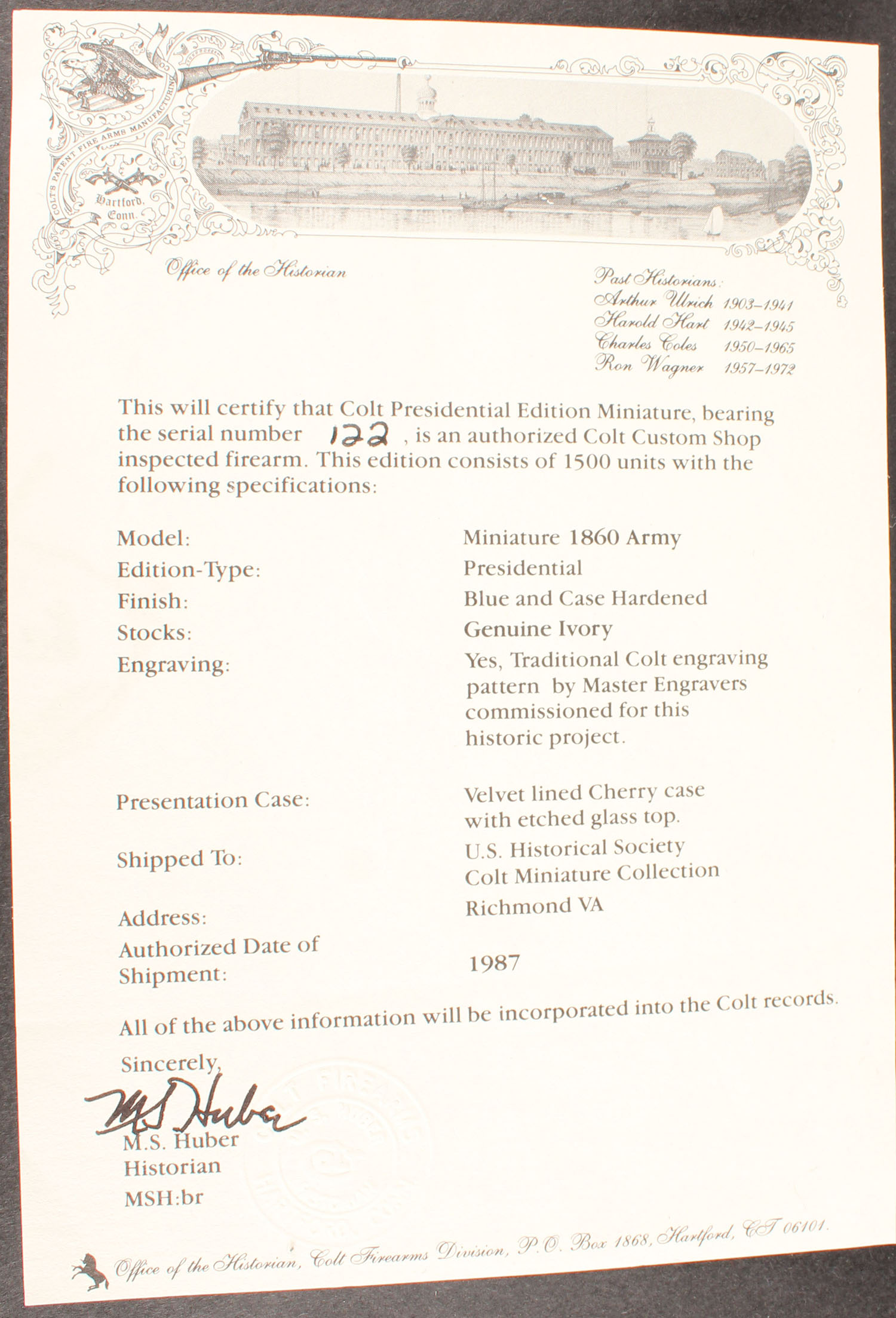 FACTORY ENGRAVED, Colt Presidential Edition Miniature 1860 Army, CAL: 21, MFG: 1980's (1987 Ship Date), SN: 122, Functioning Non-Firing Single Action Revolver, 3 3/4'' barrel. This is a 47% scale miniature Colt 1860 ''Presidential Edition'' Army revolver sold by the United States Historical Society. These were a limited edition made by Uberti in Italy, under license from Colt, for the U.S. Historical Society in the 1980s. These fancy engraved ''Presidential Edition'' miniature Colts were made in far fewer numbers than the normal plain ''Classic Edition'' models, & were far more expensive. The genuine ivory grips are excellent. The metal blue finish on the barrel, cylinder & backstrap rates 99%. The case-hardened frame, hammer & ram rod all retain vivid case-colors. The gold tone trigger guard is excellent. The frame, hammer, barrel & backstrap all display beautiful ornamental/floral scroll engraving. Bore is very good, with roughness. Groove & blade sights. Comes in non-original Colt wood presentation case,, with blue interior & blank brass plaque. Case is excellent, also comes with non-factory outer cardboard box. Comes with a Colt Factory Letter confirming configuration, information & date. This edition consists of 1500 units. This would be a neat addition to a Colt collection. FFL Req. - Value: 1000 to 2000