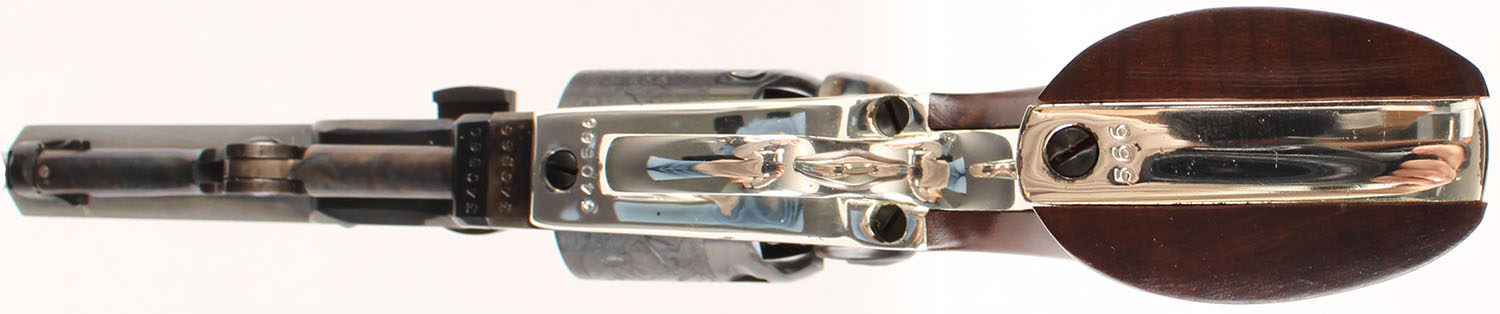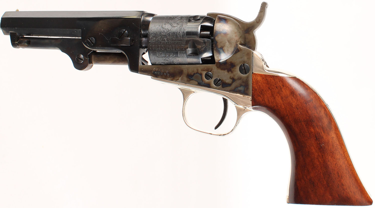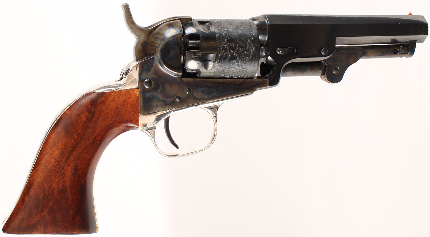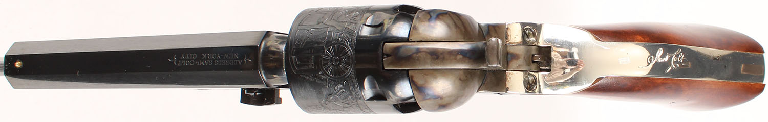 BOXED, Colt Signature Series, Model 1849 Pocket Replica, CAL: 31, MFG: N/A, SN: 340566, Single Action Percussion Revolver, 4'' octagon barrel. The wood grips are excellent. The metal blue finish on the barrel & cylinder rates 99%. The stagecoach scene on the cylinder is crisp. The case-hardened frame & ram-rod retain vivid case-colors. The nickel plated trigger guard & backstrap rates 98%. Bore is excellent. Notch & cone sights. Comes in factory box, with instruction manual. Blackpowder, No FFL Req. - Value: 400 to 800