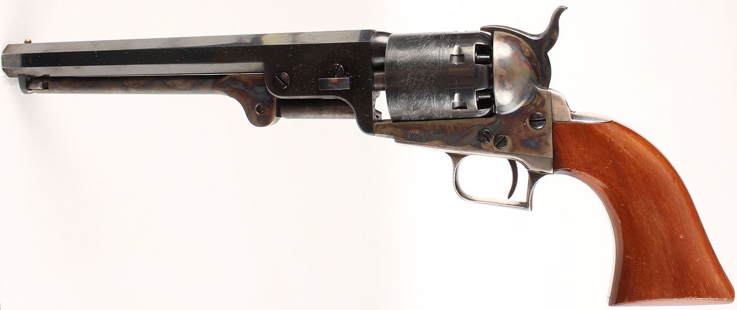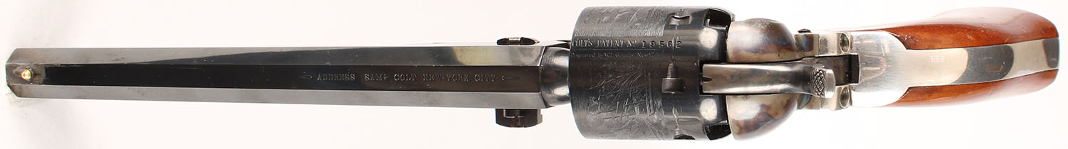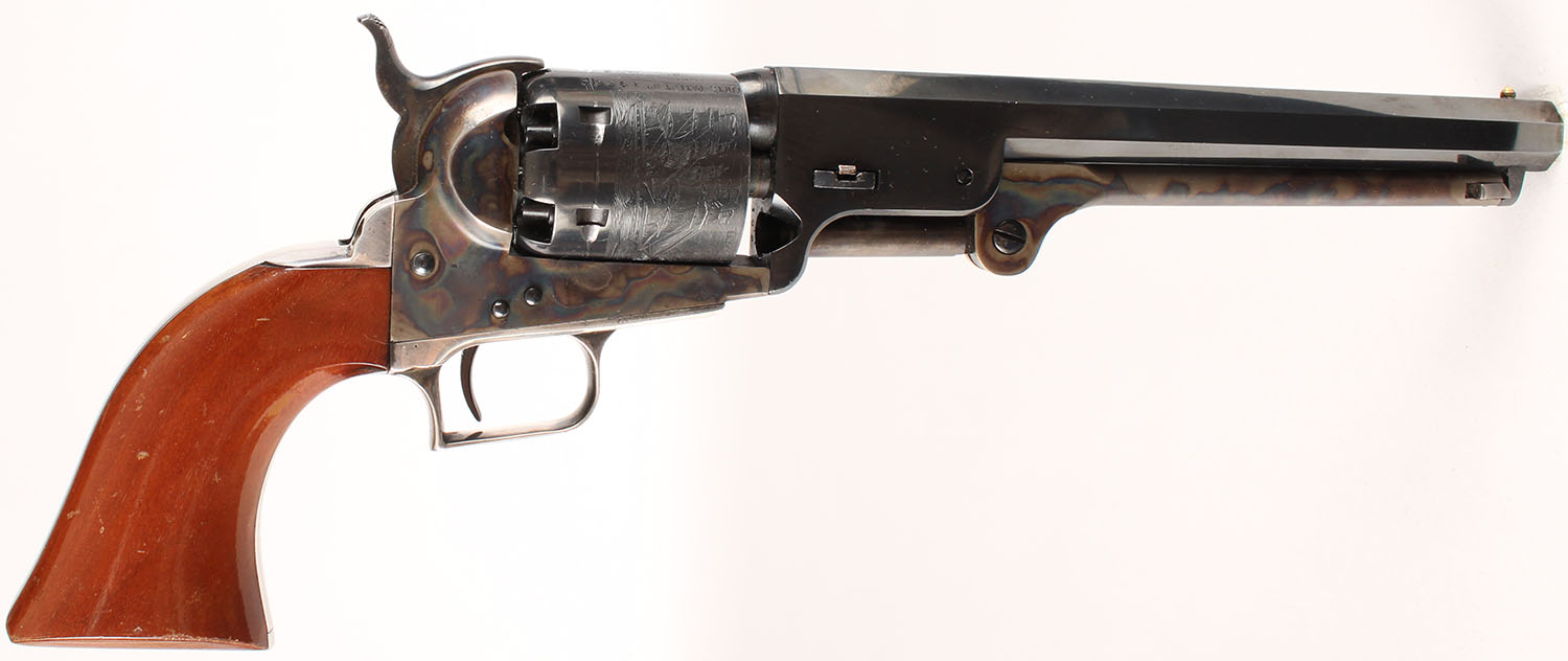 Colt, 1851 Navy Replica, CAL: 36, MFG: 1970's, SN: 19562, Single Action Percussion Revolver, 7 1/2'' octagon barrel. The wood grips are excellent. There are contusions, dings to the high gloss finish. The metal blue finish on the barrel & cylinder rate 95%+, with minor loss on the top of the barrel & edge wear at the muzzle. The case-hardened frame, hammer, & ram rod all retain vivid case-colors. Silver trigger guard & backstrap are excellent. Bore is excellent. Bead front sight. Colt's Manufacturing Company made a limited edition series from 1971 to 1976. These Colt percussion revolvers were reintroduced in 1971 (1851 Navy) & 1974 (3rd Model Dragoon). Both models were discontinued in late 1976. Blackpowder, No FFL Req. - Value: 300 to 600