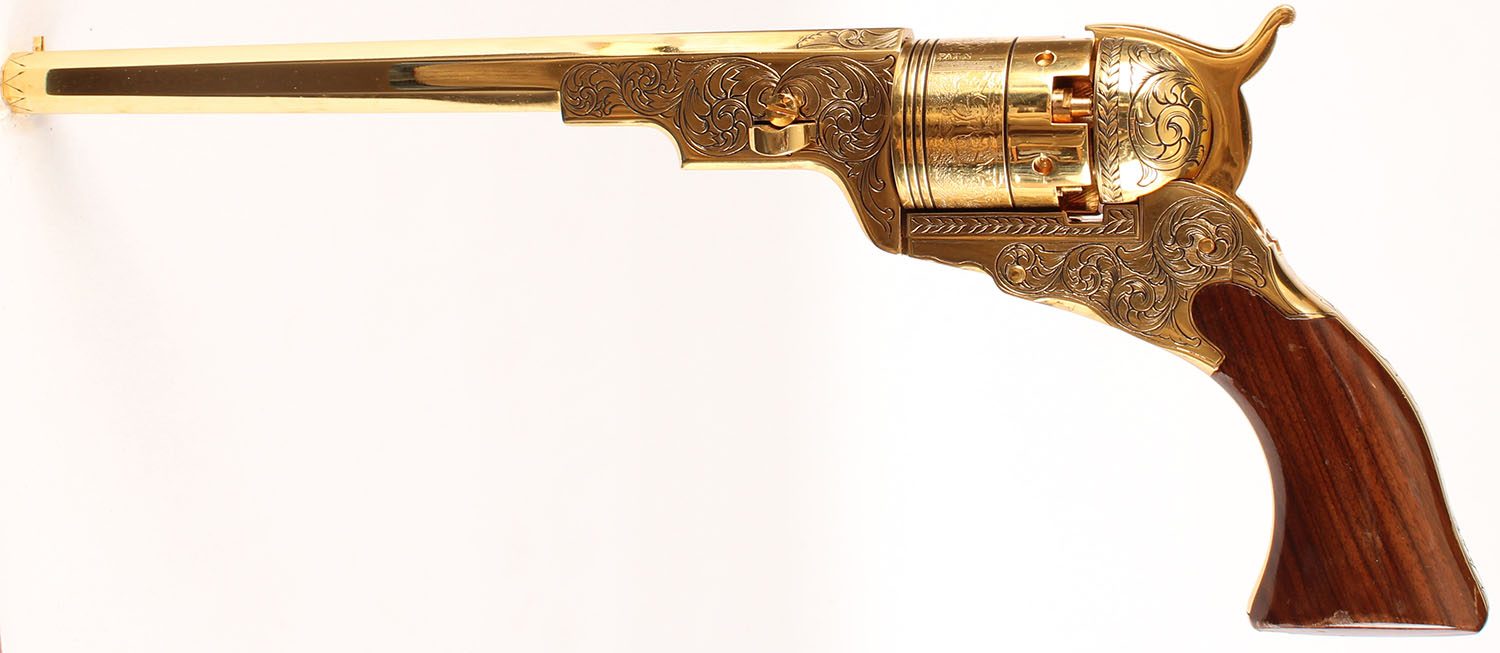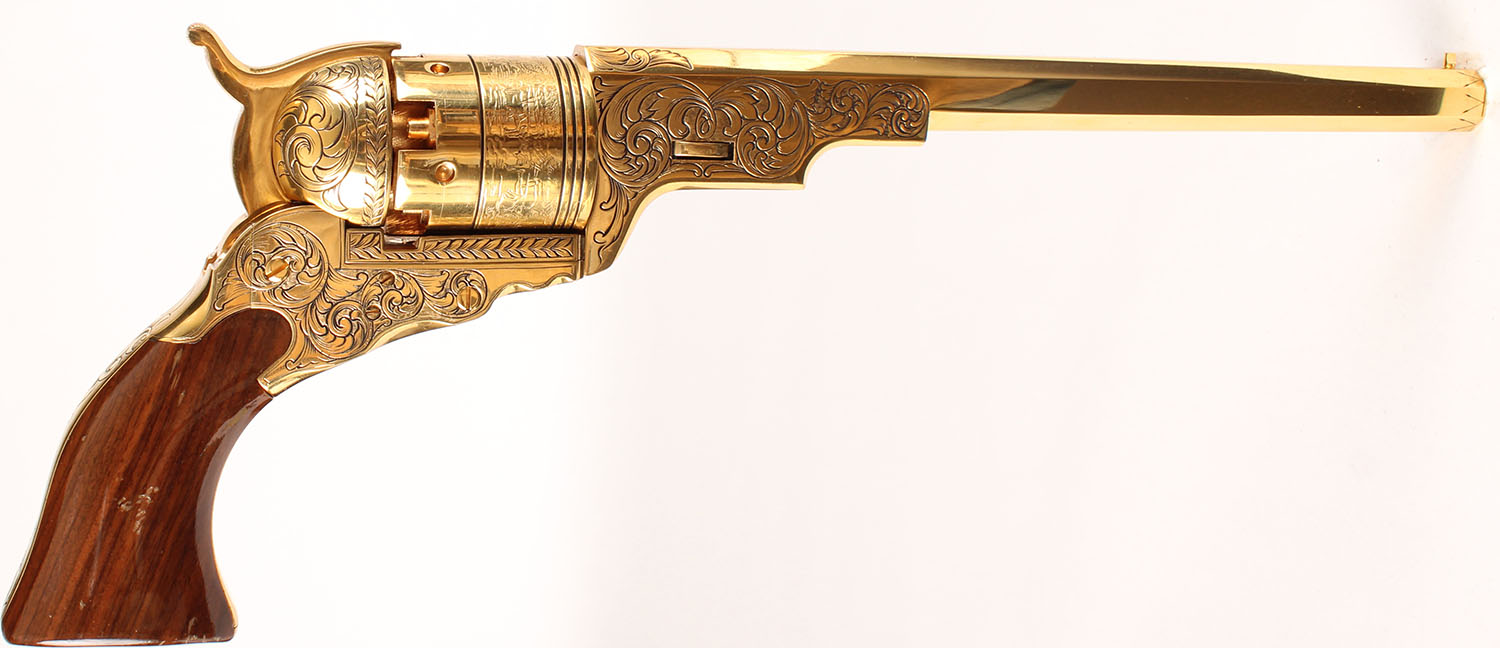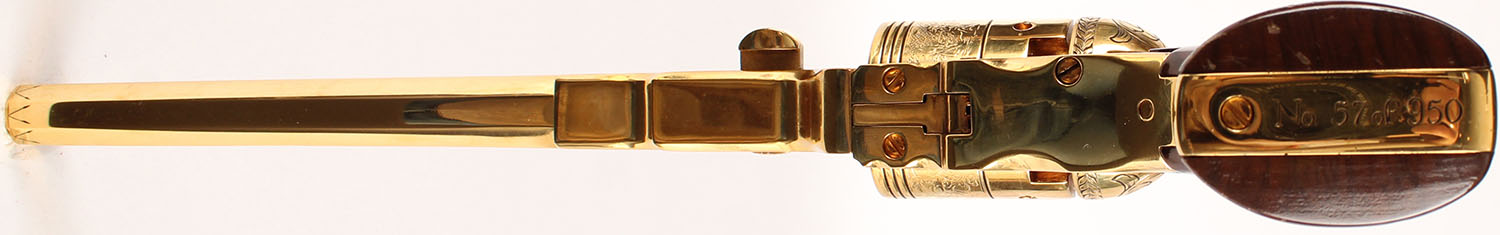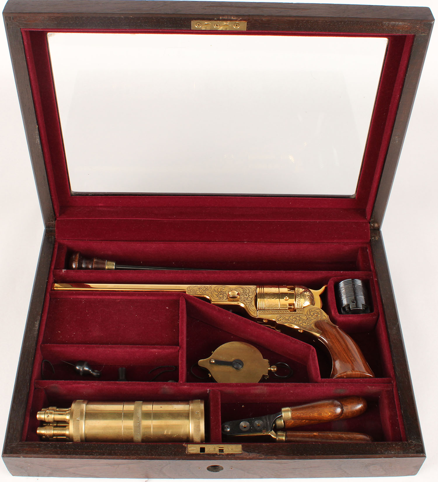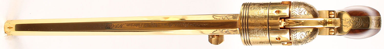 CASED, Patent Arms Mfg. CO, Texas Paterson Commemorative: Issued by The American Historical Foundation, CAL: .36, MFG: N/A, SN: 57, Percussion Revolver, 9'' octagon barrel. The wood grips are excellent. There are a couple handling marks & dings to the high gloss finish. The gold finish is excellent overall. The frame, barrel housing, cylinder & backstrap all display ornamental scroll engraving. The top of the barrel is marked ''PATENT ARMS MG. CO. PATERSON, N.J. COLT'S PT.''. The butt of the gun is marked ''57 of 950''. Bore is excellent. Rear groove & post front sight. Comes in wood/glass presentation case, with bullet die, powder container, tool, percussion cap dispenser, cleaning rod & extra blued cylinder. Texas Paterson Commemorative plaque is missing. Case is excellent, with some storage marks & dings, front lock is missing. Previous owner most likely smoked. Blackpowder, No FFL Req. - Value: 1000 to 2500