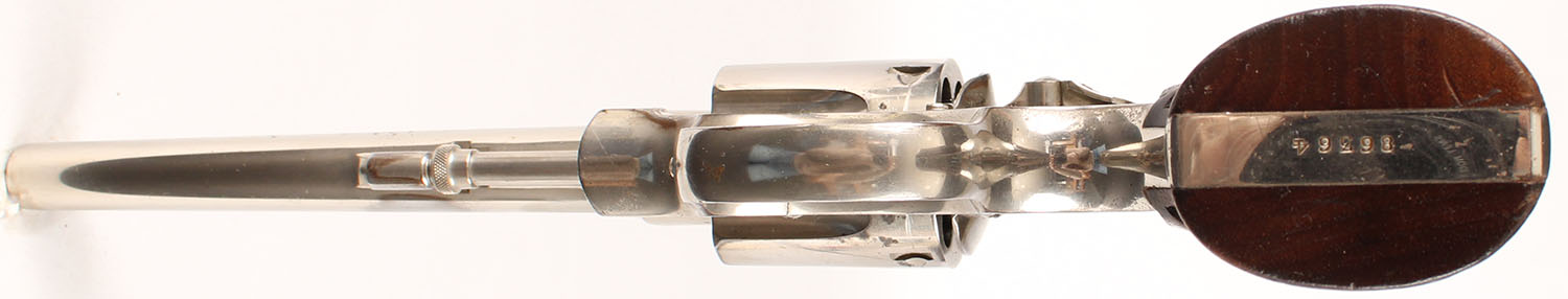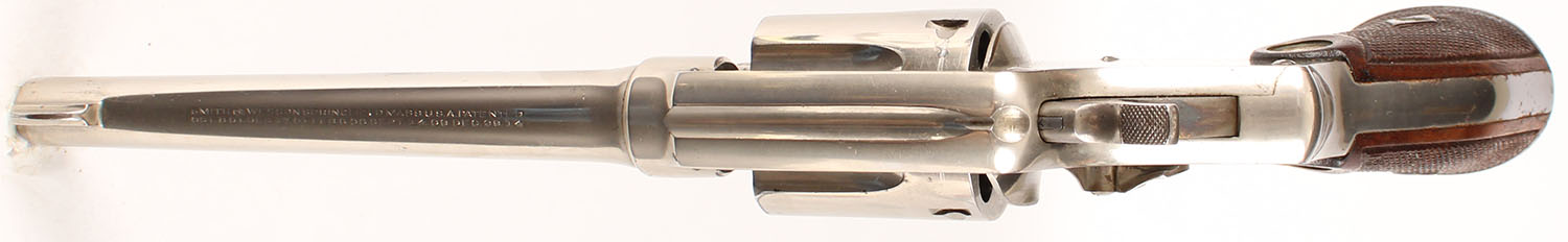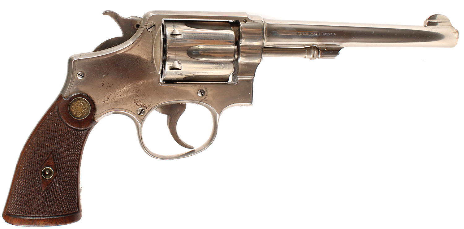 Smith & Wesson, .32-20 Hand Ejector Model of 1905 4th Change, CAL: 32 WCF, MFG: 1915-25, SN: 86364, Double Action Revolver, 6'' barrel. All matching SN on the butt, cylinder face & bottom barrel flat. There is a two line address & patent date on the top of the barrel. The left side of the barrel is marked ''SMITH & WESSON'' & the right side of the barrel is marked ''.32 WCF CTG''. There are no markings on the frame. The S&W brass logo medallion checkered wood grips are excellent. There are minor dings & scrapes to the finish. The nickel finish rates 85% overall. There are areas of oxidization, with spotting/speckling toned to a brown patina. The case-hardened hammer & trigger retain visible case-colors. Bore is very good & bright, with rough patches. Rear groove & blade front sight. This example has the heat treated cylinder, this change started at SN 81287. S&W handguns chambered in .32-20 were discontinued prior to WWII & were never resumed. FFL or C&R Req. - Value: 500 to 1000