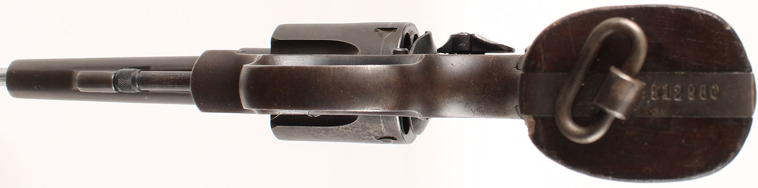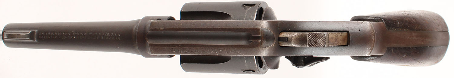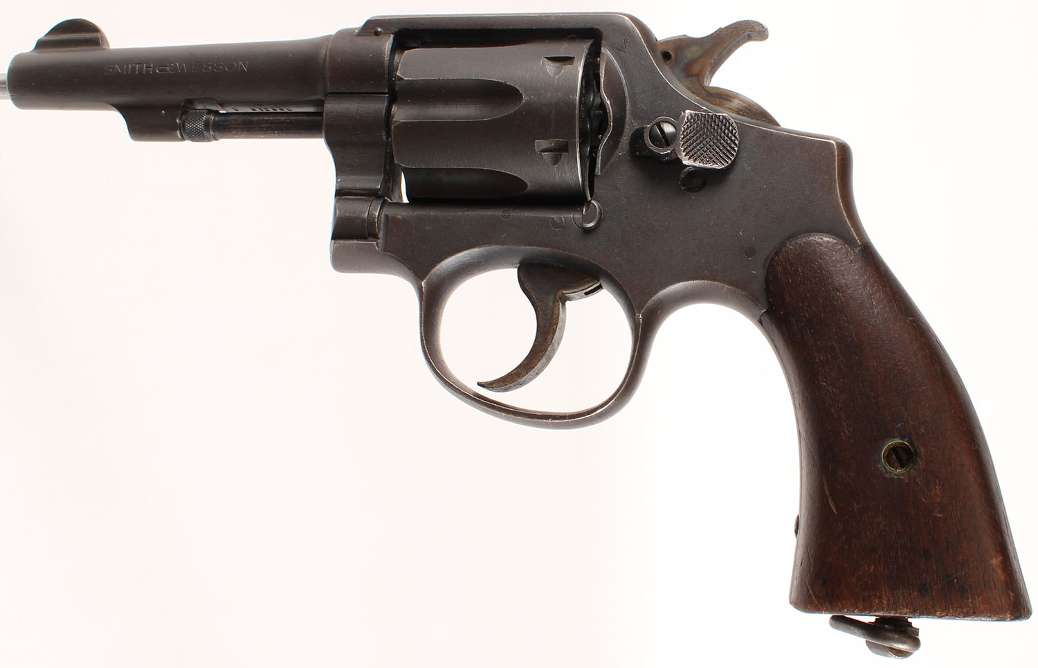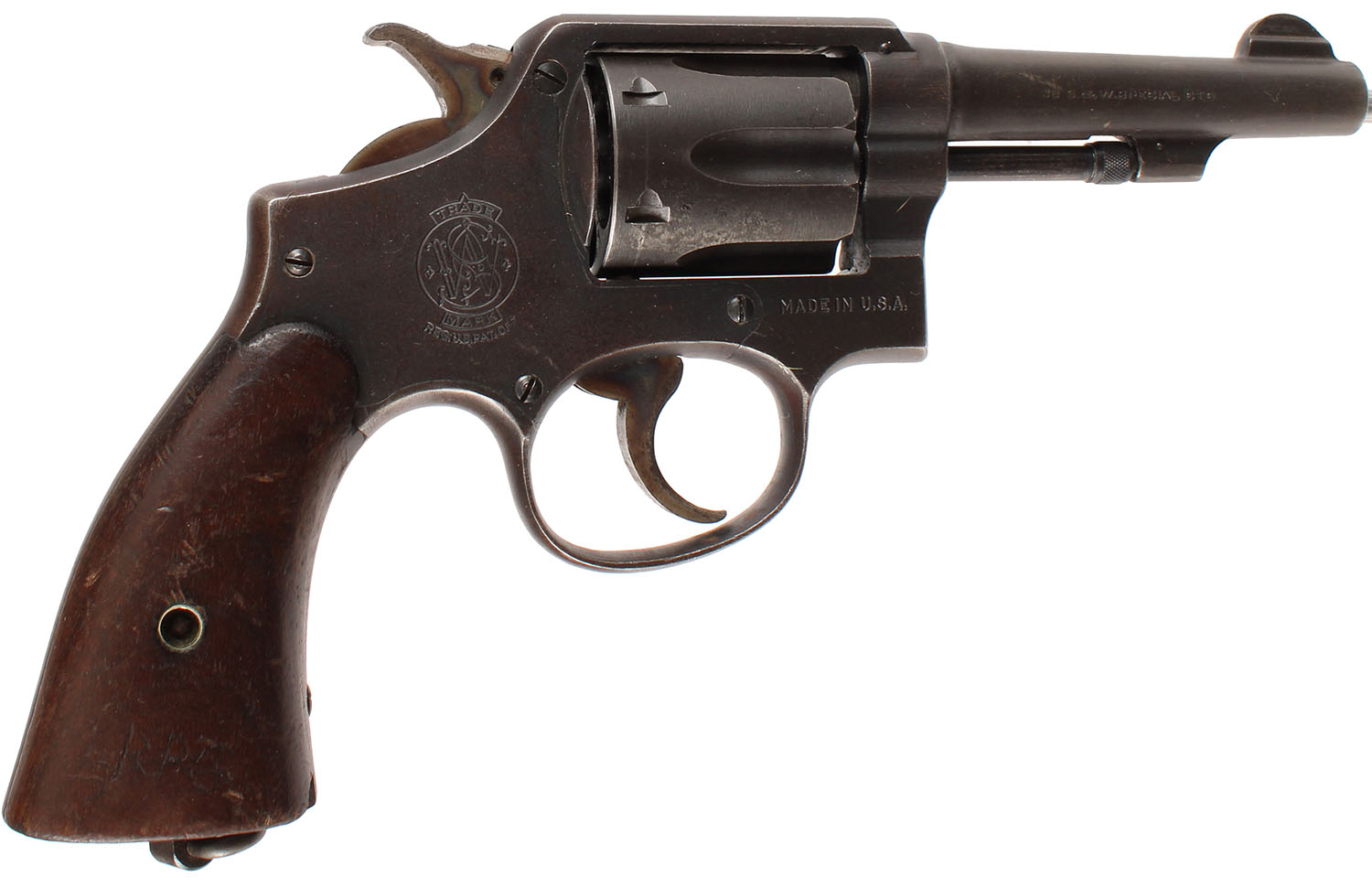 Smith & Wesson, .38 M&P ''Victory'' Model, CAL: 38 S&W SPL, MFG: 1942-45, SN: V 512980, Double Action Revolver, 4'' barrel. The original wood grips are very good & solid. The right grip has the initials ''RPG'' carved into it, along with a small edge chip, scrapes & dings. The factory ''Black Magic'' finish (similar to Parkerizing) rates 70 % overall, with areas toned to brown patina. The case-hardened trigger & hammer retain visible case colors. Bore is excellent. Groove & blade sights. The top strap marked '' (Flaming Bomb) U.S PROPERTY GHD''. Lanyard loop present. For a utilized military pistol, this example is still in well kept condition. FFL or C&R Req. - Value: 400 to 800