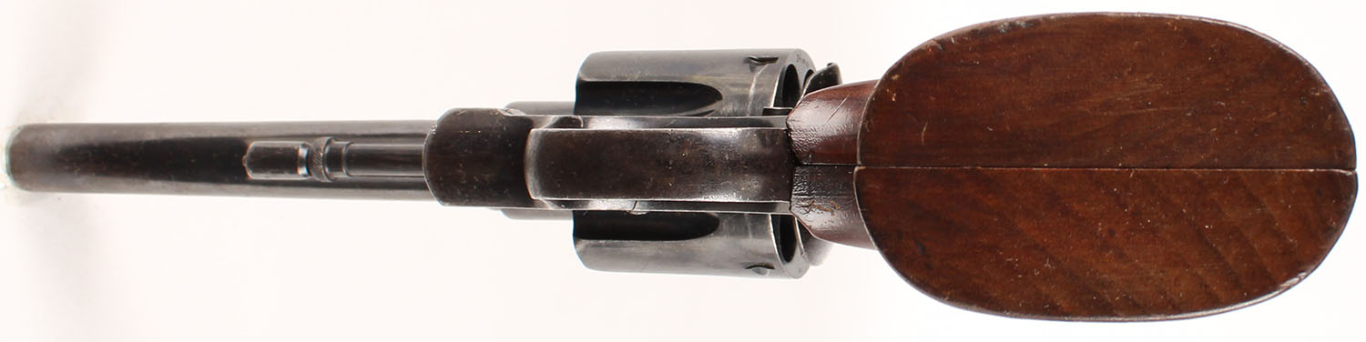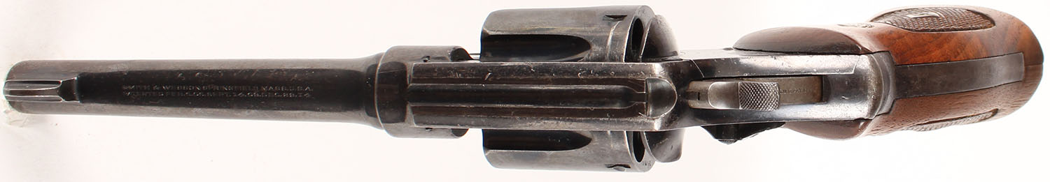 Smith & Wesson, Model 1917 Brazilian Contract (1st Contract), CAL: 45 ACP, MFG: 1937, SN: 198768, Double Action Revolver, 5 1/2'' barrel. The right side of the frame carries the Brazilian crest & bears the date ''1937''. The S&W logo medallion checkered wood grips are excellent. There are contusions, light scrapes & dings. These are replacement grips. The original grips that came on this pistol were smooth. The metal blue finish rates 70% overall, with consistent wear & a thin brown patina. Bore is excellent, with intermittent roughness. Notch & blade sights. 25,000 Model 1917's were made for the Brazilian Government. This example was apart of the first shipment in 1938, which was a majority of all the pistols sent. FFL or C&R Req. - Value: 300 to 500