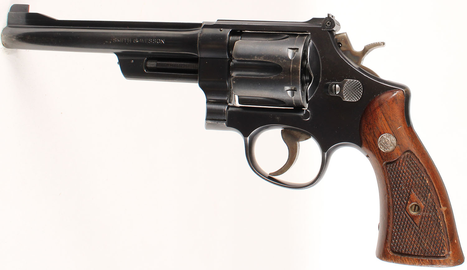 Smith & Wesson, .38/44 Outdoorsman Model of 1950 ''Pre-Model 23'', CAL: 38 S&W SPL, MFG: 1951-52, SN: S85818, Double Action Revolver, 6 1/2'' barrel. All matching SN. The Magna style diamond checkered wood grips are very good. There are nicks, scrapes & dings to the original finish. The metal blue finish rates 90% overall. Bore is excellent. Adjustable rear sight & elevated blade front sight. 6,039 were manufactured from 1950-57. FFL or C&R Req. - Value: 800 to 1600