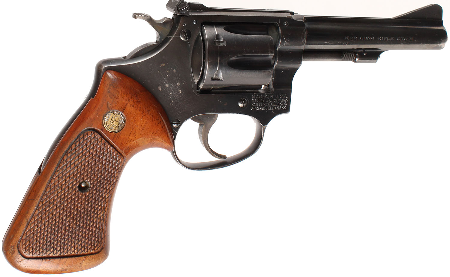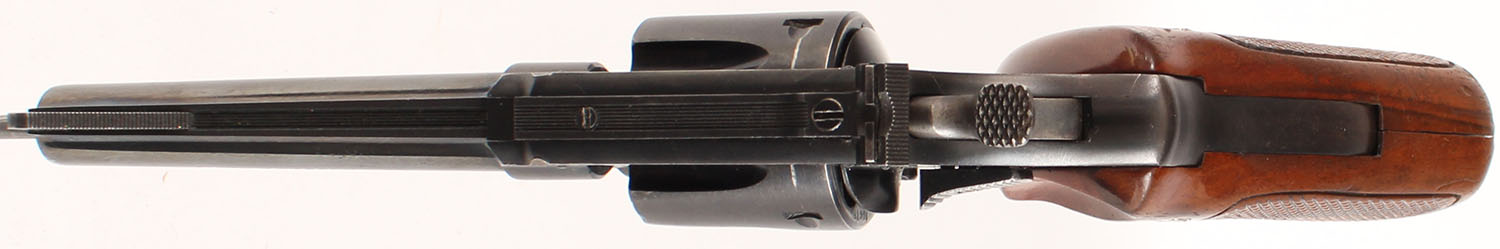 Smith & Wesson, Model of 1953 .22/32 Kit Gun ''Pre Model 34'', CAL: 22LR, MFG'' 1953-57, SN: 10678, Double Action Revolver, 4'' barrel. The S&W logo medallion checkered wood grips are excellent. There are handling marks & light wear to the finish. The metal blue finish rates 85% overall. Bore is excellent, with areas of visible roughness. Adjustable rear sight & serrated blade front sight. This revolver was continued as the Model 34 in 1957. FFL or C&R Req. - Value: 500 to 1000