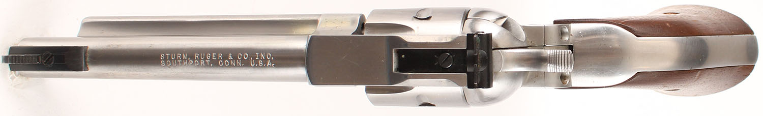 Ruger, New Model Single Six, CAL: 22 LR, MFG: 1974-75, SN: 62-72277, Single Action Revolver, 5 1/2'' barrel. The Ruger logo medallion wood grips are excellent. There are handling marks, scrapes & dings. The stainless steel finish is excellent, with light scuffs, & a few small areas of spotting. Bore is excellent. Adjustable rear sight & block elevated blade front sight. FFL Req. - Value: 400 to 700