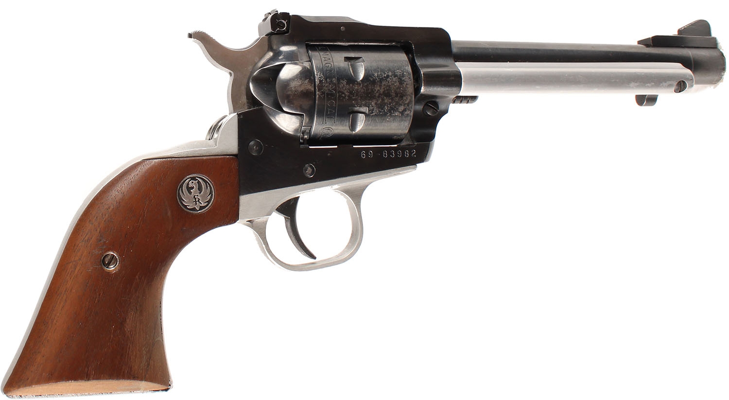 Ruger, New Model Single Six, CAL: 22 MAG, MFG: 1983, SN: 69-83982, Single Action Revolver, 5 1/2'' barrel. The Ruger logo medallion wood grips are very good. There is a repaired break on the right grip along with other contusions, scrapes & dings. The metal blue finish on the barrel rates 90%, with cleaned pitting worn to metal gray & toned to a brown patina. The frame rates 90% & the cylinder rates 90%, with cleaned spotting worn to metal gray & toned to a brown patina. The ejection rod housing & grip frame are replaced with aluminum parts. Bore is excellent, with roughness near the muzzle. Adjustable rear sight & block elevated serrated blade front sight. FFL Req. - Value: 150 to 350