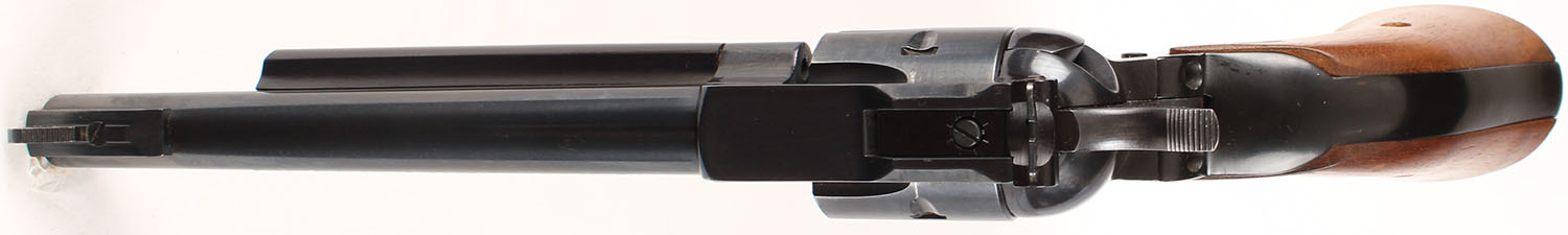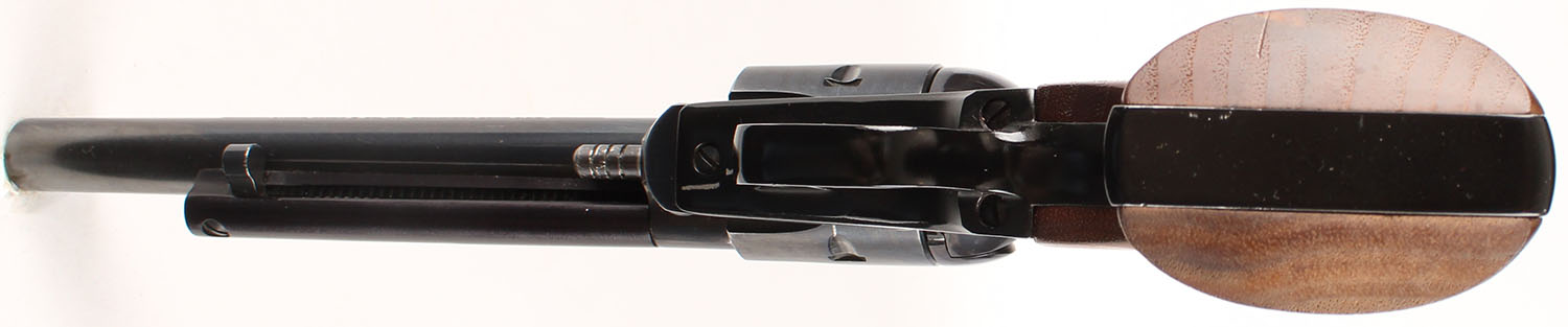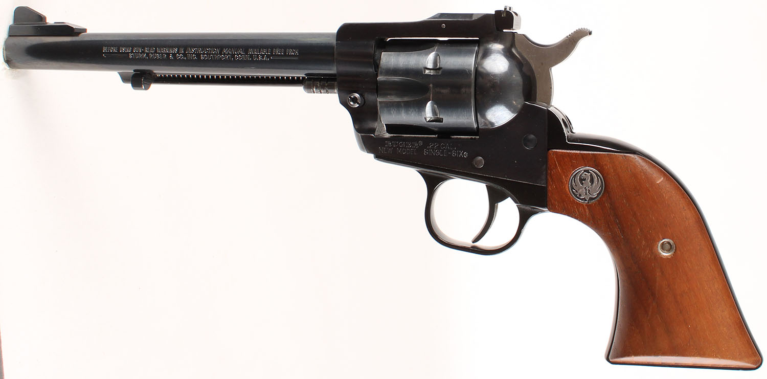 Ruger, New Model Single Six, CAL: .22LR, MFG: 1984, SN: 260-25334, Single Action Revolver, 6 1/2'' barrel. The Ruger logo medallion wood grips are excellent. There are minor storage marks to the finish. The metal blue finish rates 97% overall. Bore is excellent. Adjustable rear sight & block elevated serrated blade front sight. FFL or C&R Req. - Value: 400 to 800