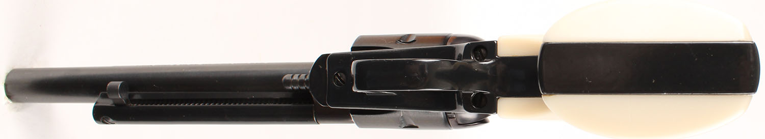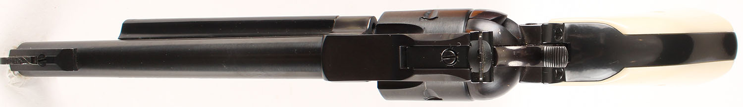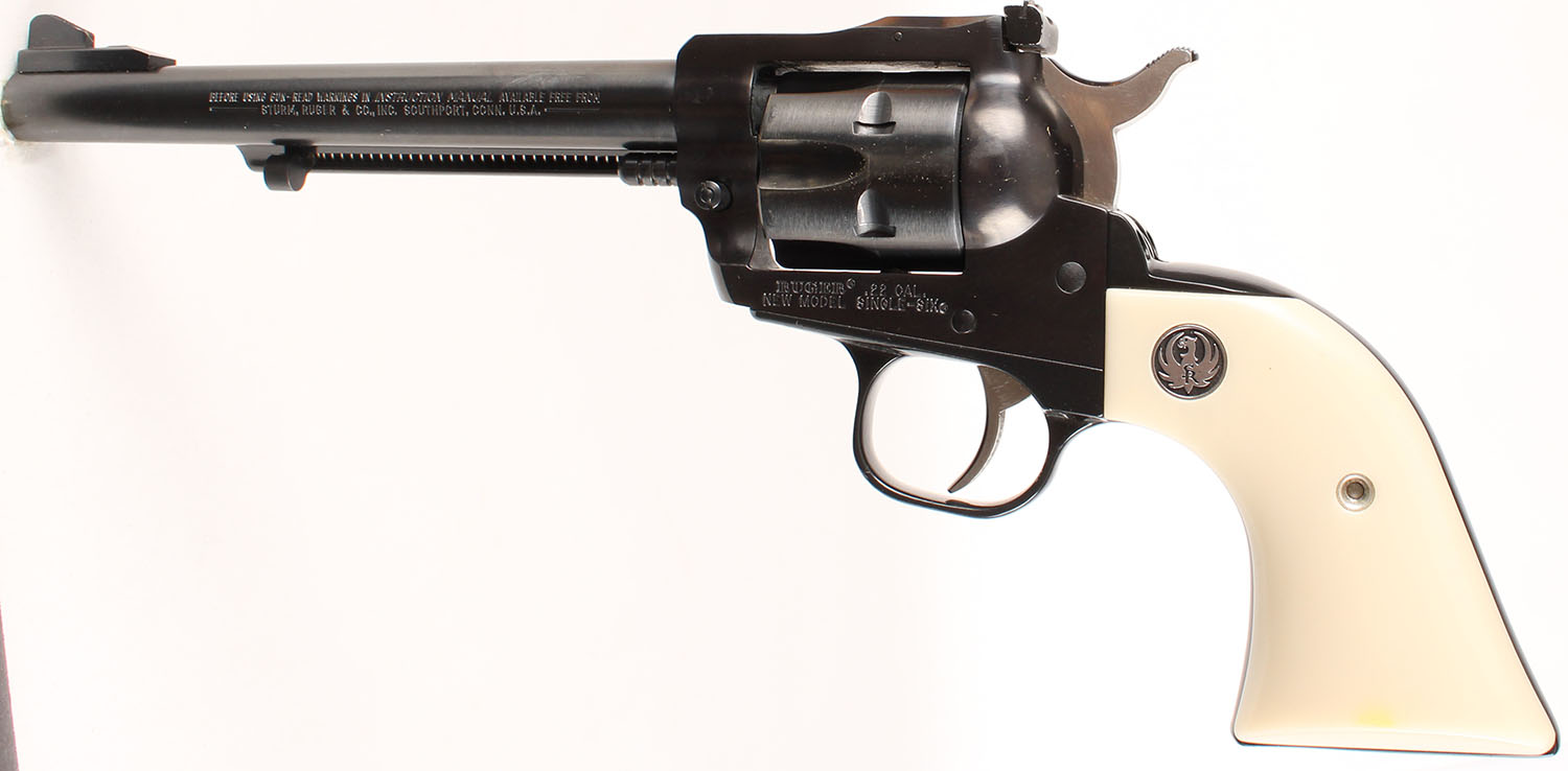 Ruger, New Model Single Six, CAL: 22LR, MFG: 1996, SN: 263-18990, Single Action Revolver, 6 1/2'' barrel. The Ruger logo medallion faux ivory grips are excellent. The metal blue finish rates 98% overall. Bore is excellent. Adjustable rear sight & elevated serrated blade front sight. Comes in period correct box, no label. FFL Req. - Value: 400 to 700