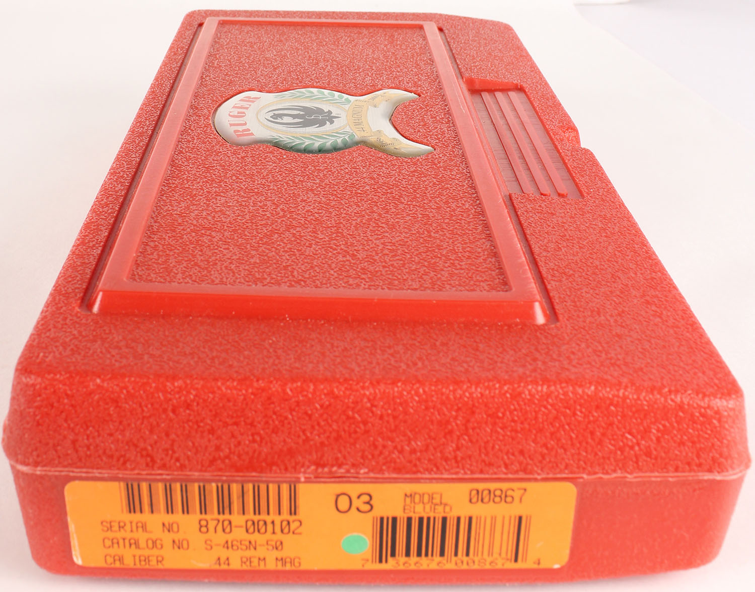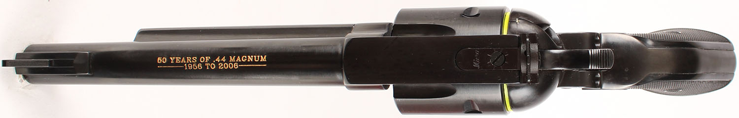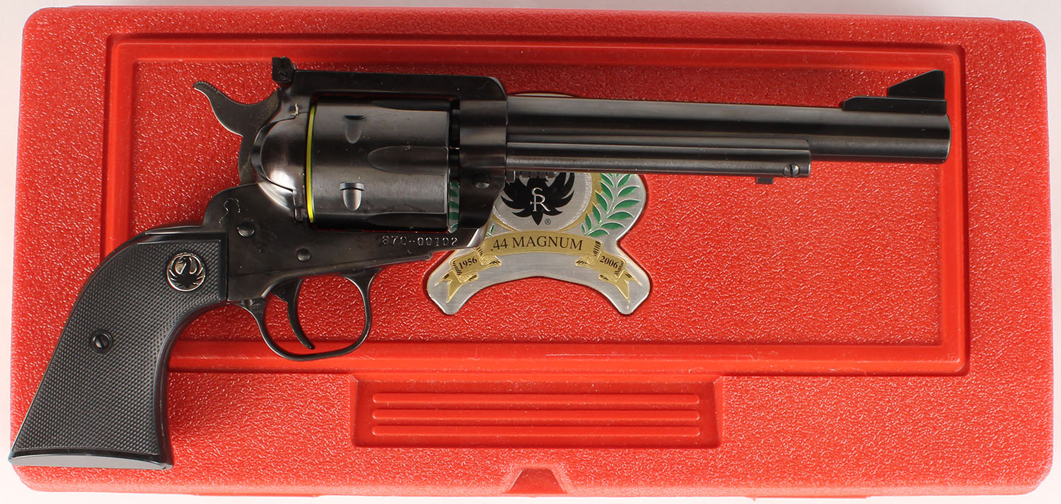 NEW, BOXED Ruger, New Model Blackhawk, 50 Years of .44 Magnum Edition, CAL: .44 MAGNUM, MFG: 2006, SN: 870-00102, Single Action Revolver. The factory Ruger logo medallion & checkered grips are excellent. The metal blue finish rates 99%+ overall. The top of the barrel is marked in two lines ''50 Years of .44 Magnum 1956-2006''. Bore is minty. Factory adjustable rear sight & elevated serrated blade front sight. Comes in original red hard case, with related paperwork, test fire cartridge, lock & original packaging. NIB. NOS. FFL Req. - Value: 800 to 1200