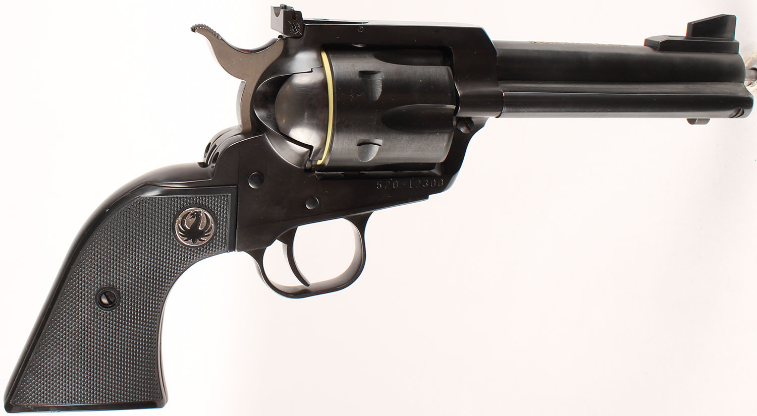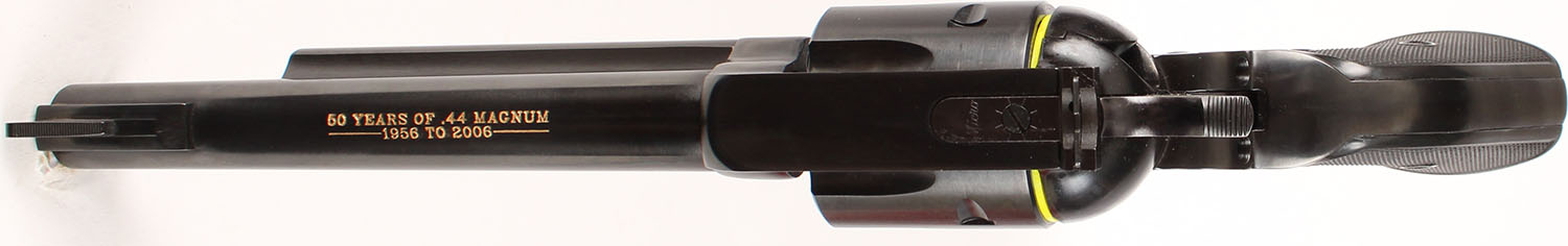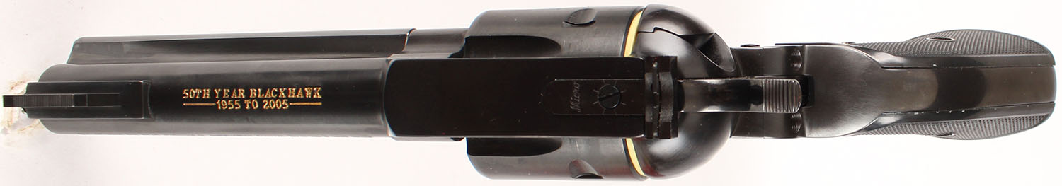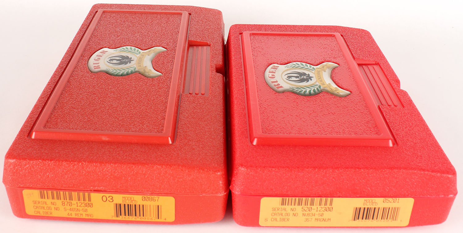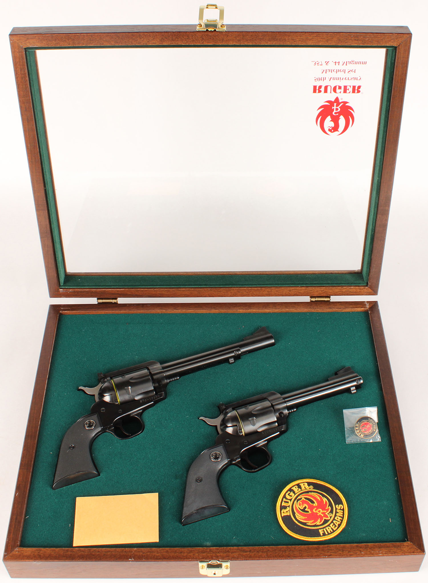 BOXED & CASED, Ruger 50th Anniversary Edition, Matched Pair, (1) Ruger, New Model Blackhawk, CAL: .357 MAG, MFG: 2006, SN: 520-12300, Single Action Revolver, 4 3/4'' barrel. The Ruger logo medallion checkered plastic grips are excellent. The factory metal blue finish rates 99%+ overall. Bore is mint, appears unfired outside factory test. Cylinder has plastic safety disc. The frame holds a Micro adjustable rear sight & the barrel has a block elevated serrated blade front sight. Comes in special edition red hard case, with related paperwork, test fire cartridge, lock/key & original packaging. (2) Ruger, New Model Blackhawk, CAL: .44 MAG, MFG: 2006, SN: 870-12300, Single Action Revolver, 6 1/2'' barrel. The Ruger logo medallion checkered plastic grips are excellent. The factory metal blue finish rates 99%+ overall. Bore is mint, appears unfired outside factory test. Cylinder has plastic safety disc. The frame holds a Micro adjustable rear sight & the barrel has a block elevated serrated blade front sight. Comes in special edition red hard case, with related paperwork, test fire cartridge, lock/key & original packaging. Included with this special edition set is a wood presentation case with green interior. It has cut-outs for both revolvers, a glass lid that's marked ''RUGER 50TH ANNIVERSARY MATCHED SET .357 & .44 MAGNUM'' and also holds a Ruger Firearms patch, pin & case key. A great commemorative set, perfect for a Ruger collection. FFL Req. - Value: 1500 to 2500